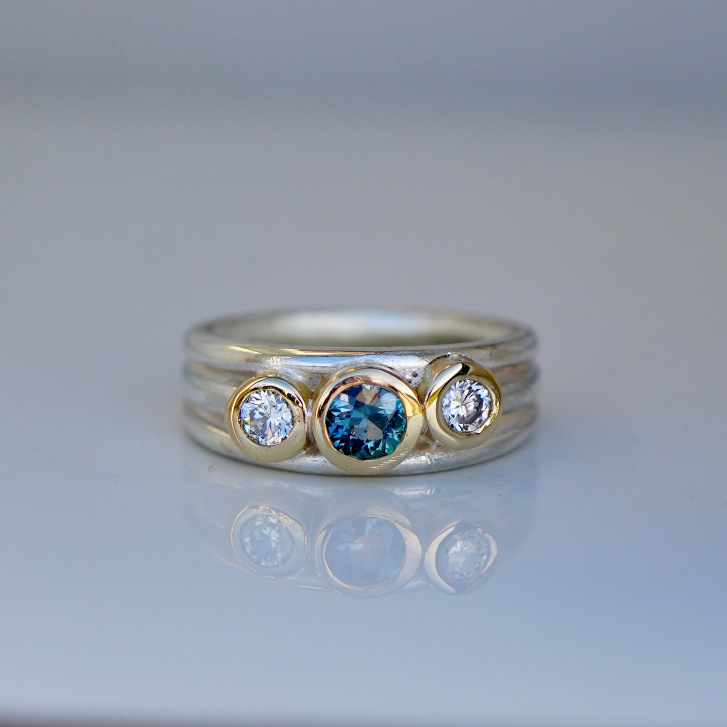 It's a trio of connected silver bands holding gold settings and gemstones. Take a look at the different options