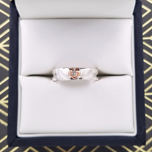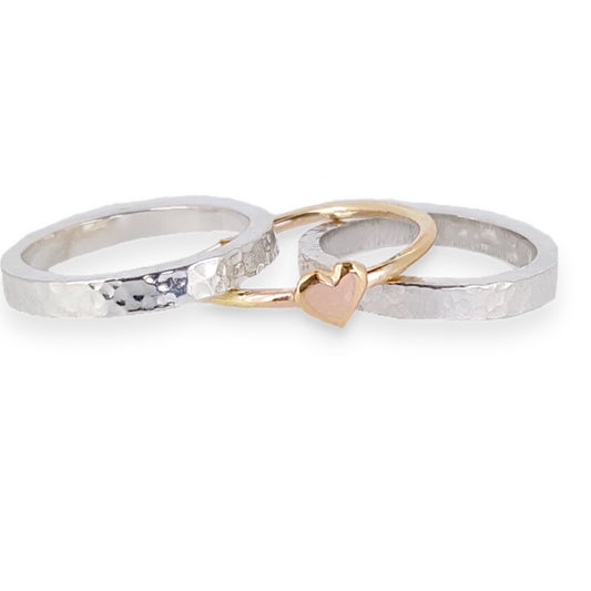 'Be Mine'. Charming hand hammered sterling silver ring set with solid gold heart.