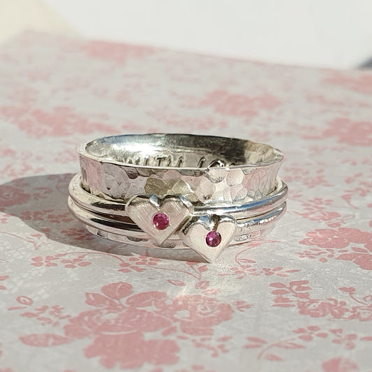 Pink to make the boys wink. Silver spinning ring with silver hearts and sparkling pink sapphires