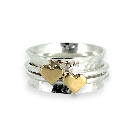 Golden delight - Handmade ring with 3 solid gold spinners, gold hearts and a sparkling diamond.
