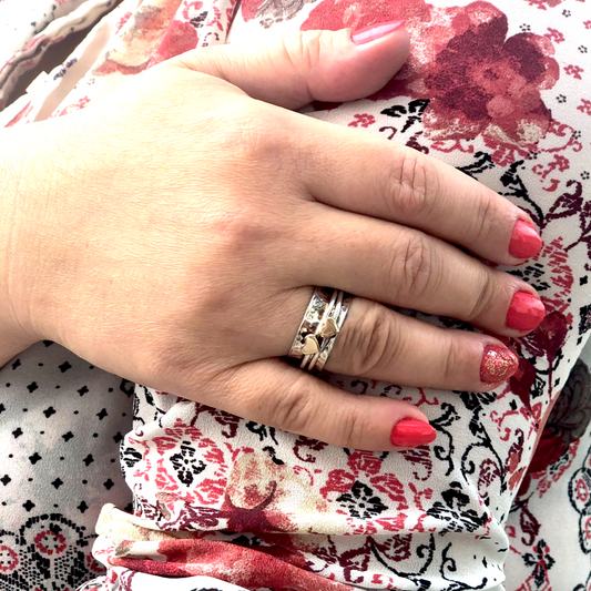 This is my perennial classic spinning ring with two hearts. I make a wide, silver inner band and add two dainty hearts on free-spinning bands. I create the hearts from the metal of your choice such as sumptuous 9ct yellow gold or lovely rose gold (my favourite).