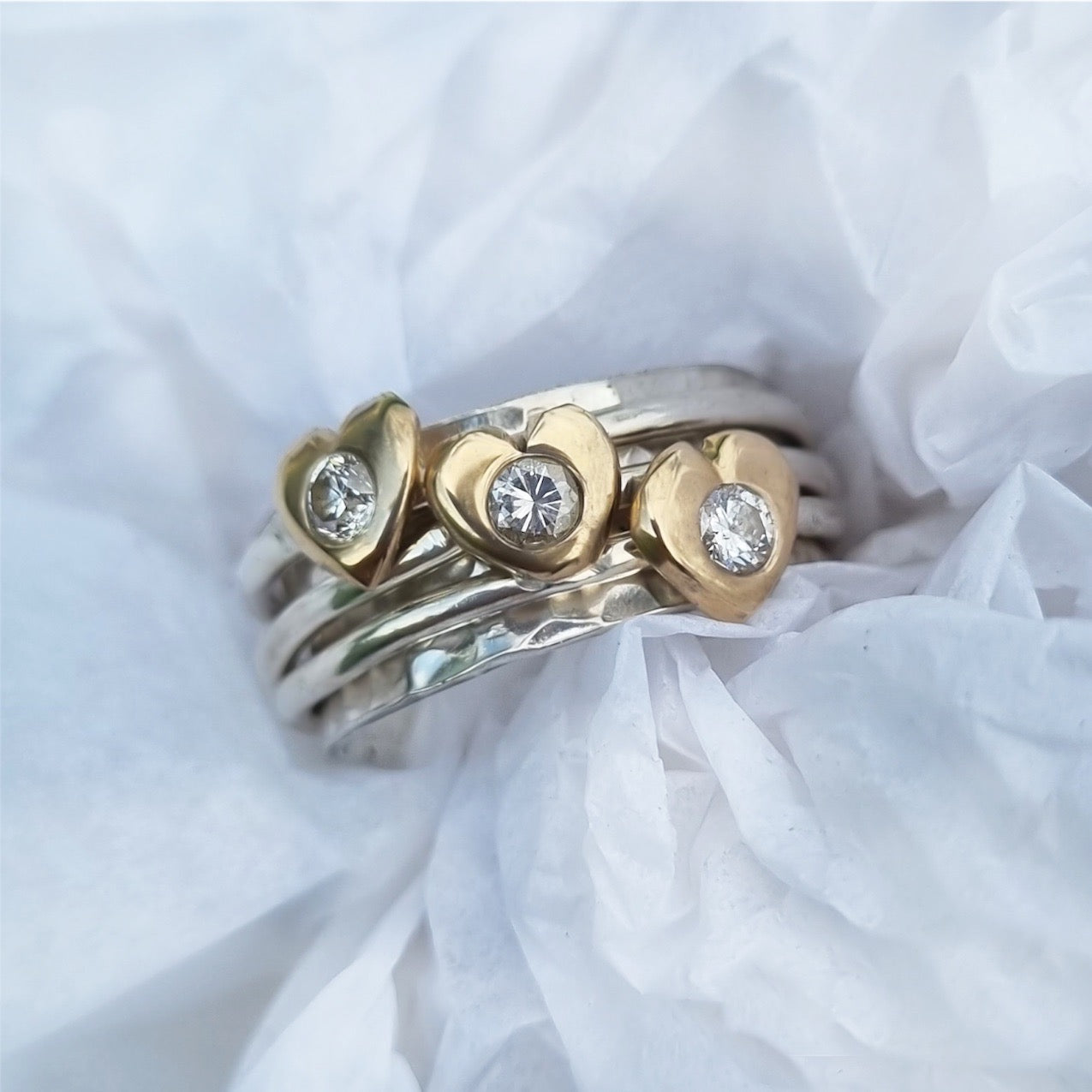 I melted down this the old ring made from 9ct gold and used it to form the hearts and inner band on this modern new piece.