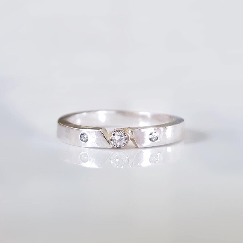 I hand form the silver band from 2mm thick solid silver which is 3mm high. The classic version of this ring uses a single 2.5mm diamond and a pair of 1.5mm diamonds. I've also added a 'maxi' version with the same size band but with a stonking 4mm diamond and a pair of 2mm diamonds.