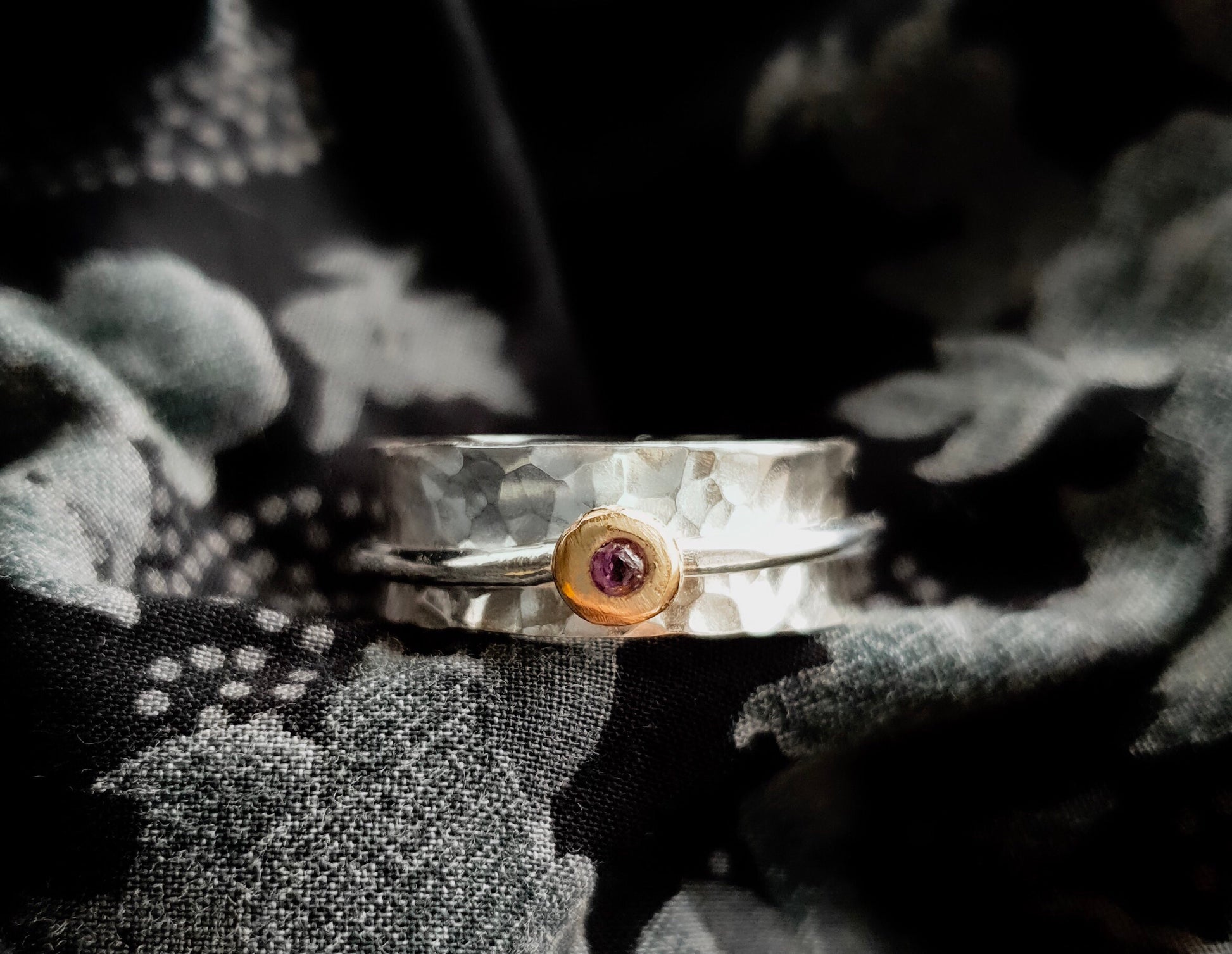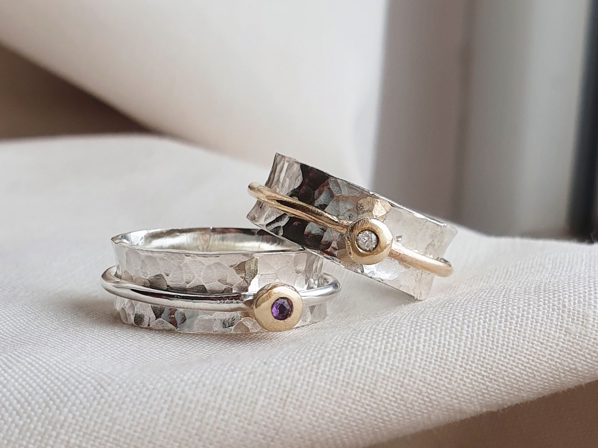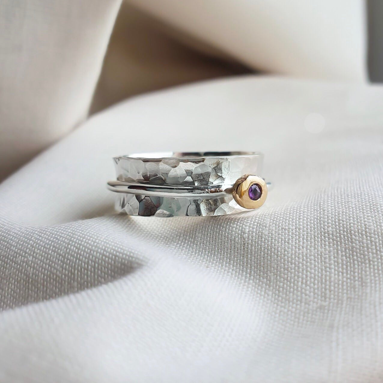 I start with a generous wide band of solid sterling silver, holding a spinning ring formed from solid silver or 9ct gold. This spinning ring is adorned with a violet 2mm amethyst in a freeform gold nugget.