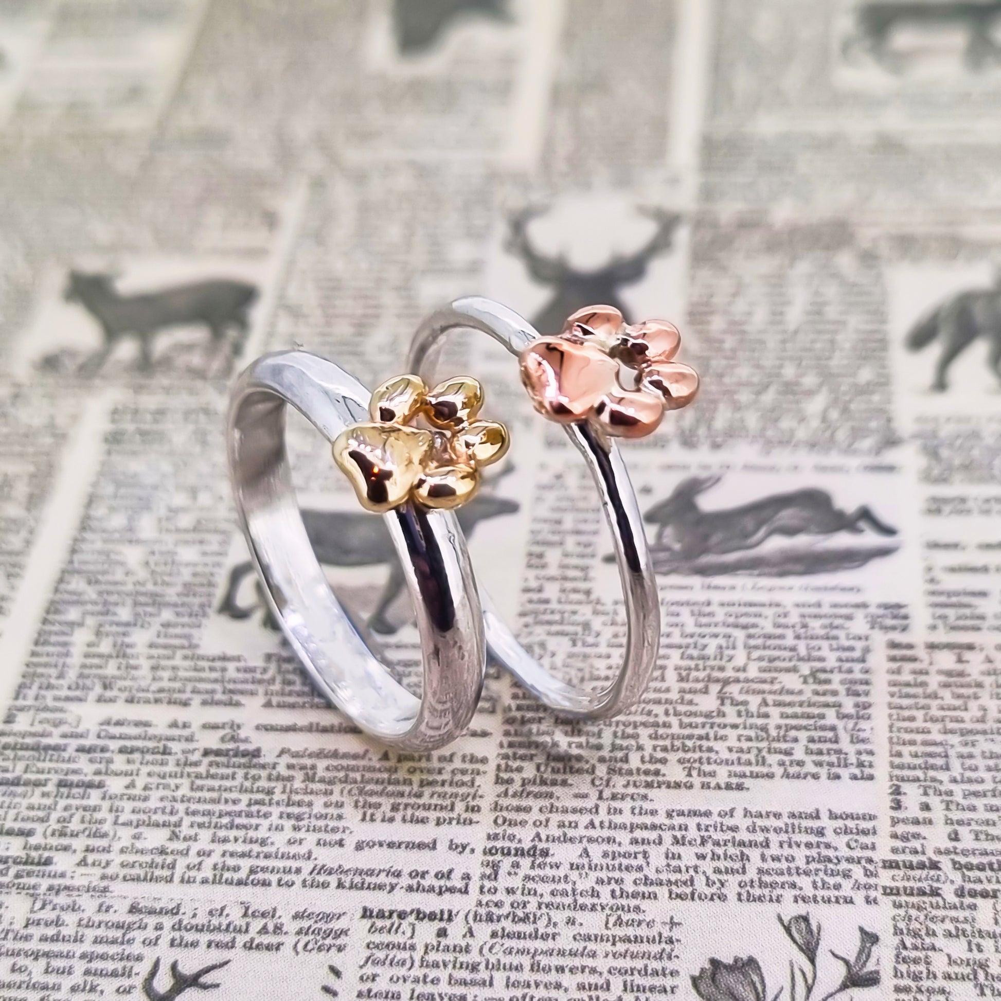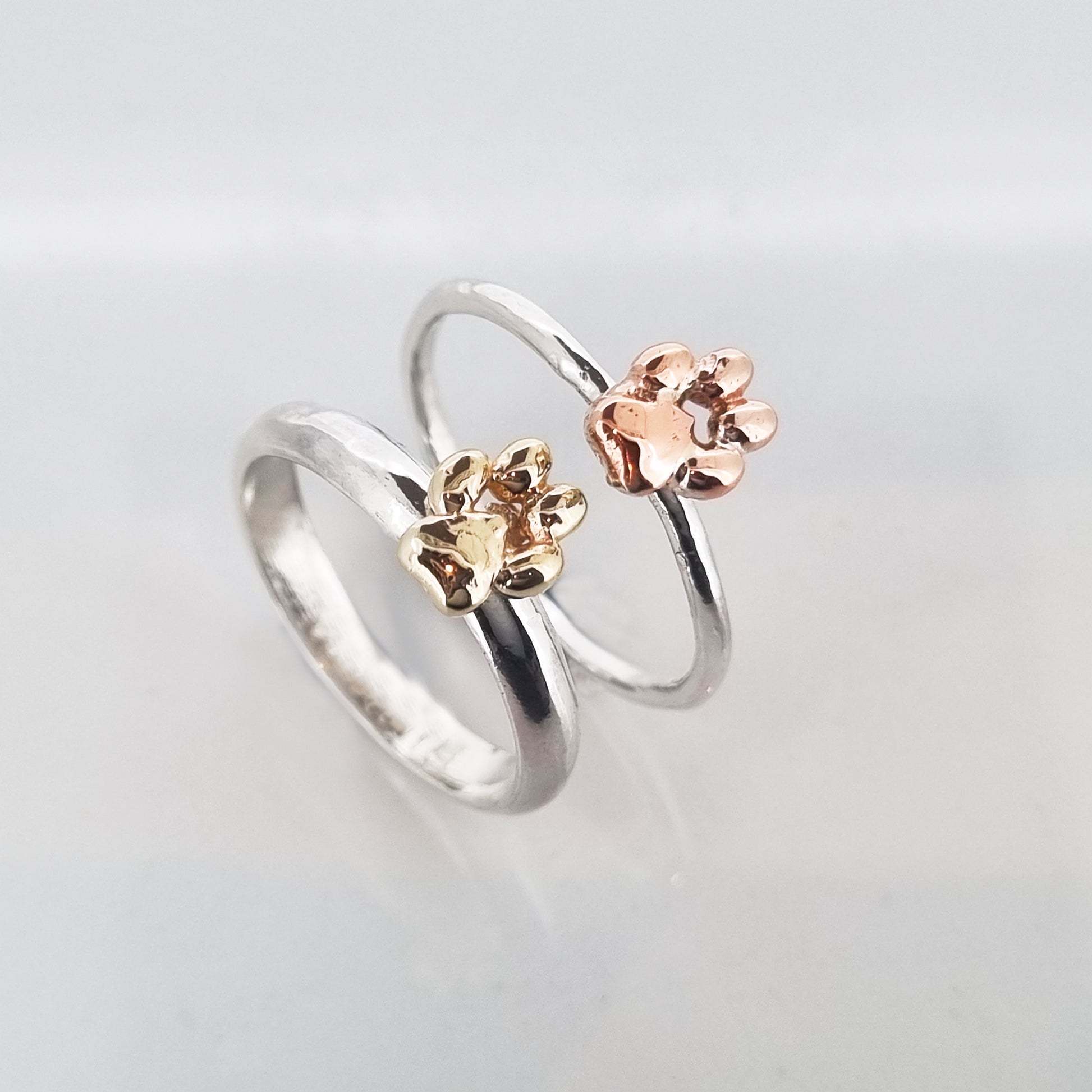 Modelled from a real paw, I finish each piece by hand, so you can choose which metal I use. Firstly, choose your silver band - either skinny round band (1.5mm across) or a thicker D shape (3mm). Then choose your paw - the paws are available in solid silver, solid 9ct yellow gold solid 9ct white gold or solid 9ct rose gold.