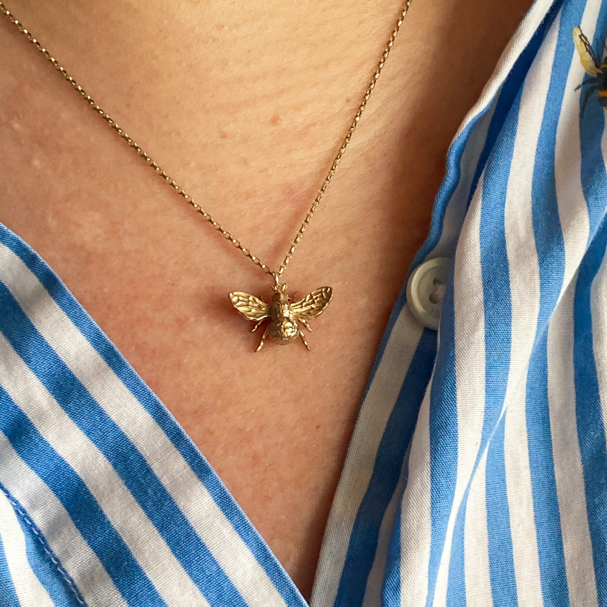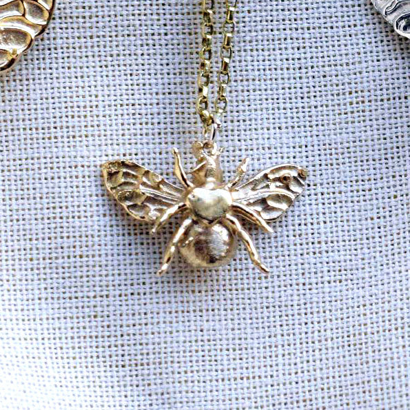 I make each piece by hand, so you can choose which metal I use. They are available in solid sterling silver or solid 9ct gold, - I use rose gold, yellow gold and white gold. Each bee hangs from a thick belcher chain made from silver