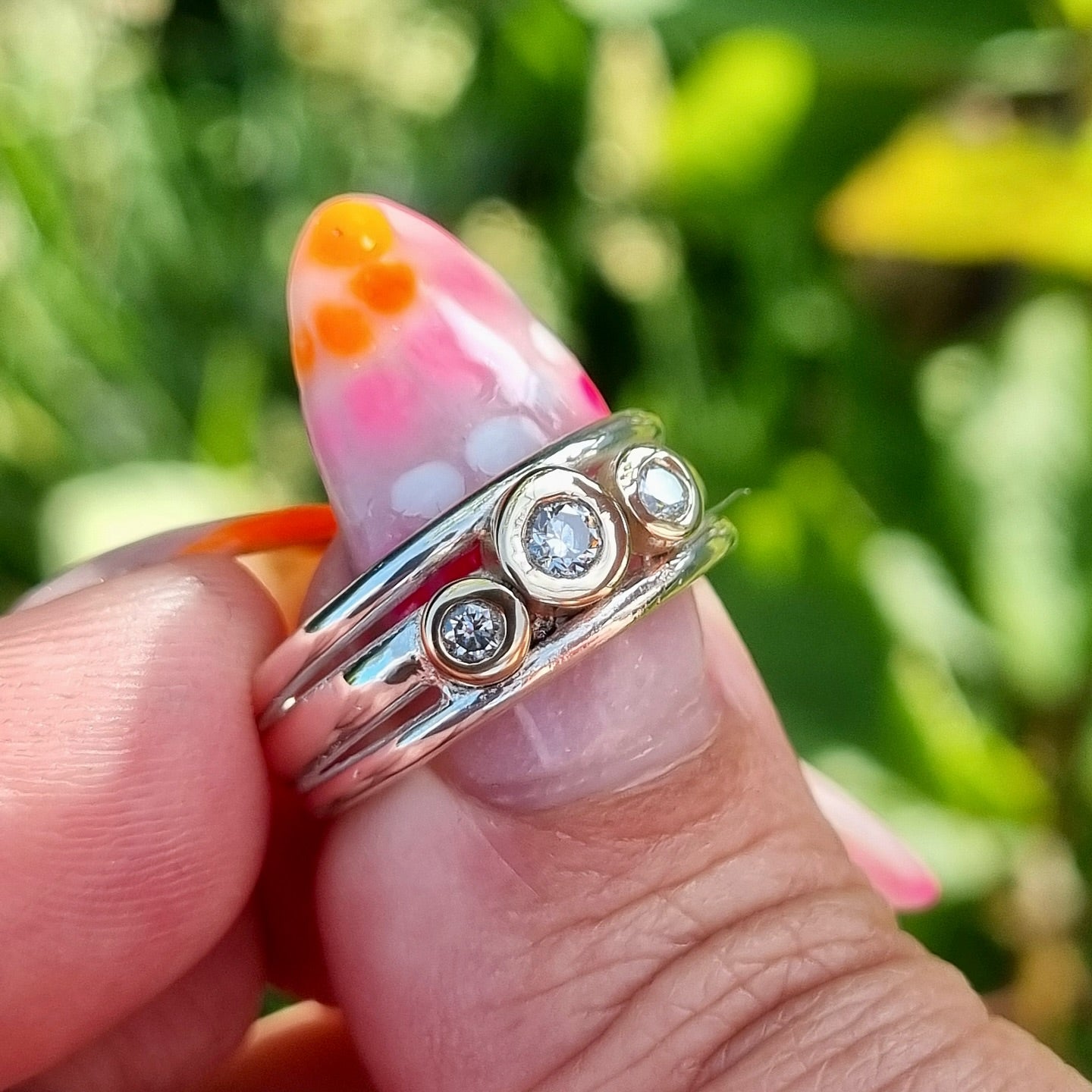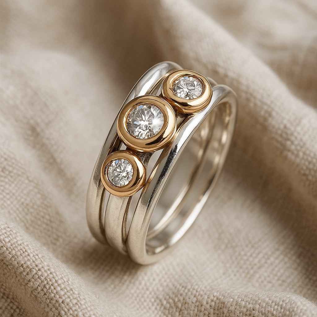 Meet the fresh, modern take on my classic Cariad ring - simple, elegant, and full of heart. This triple-band beauty is crafted from sterling silver and holds three solid 9ct gold nuggets, each set with a sparkling diamond.
