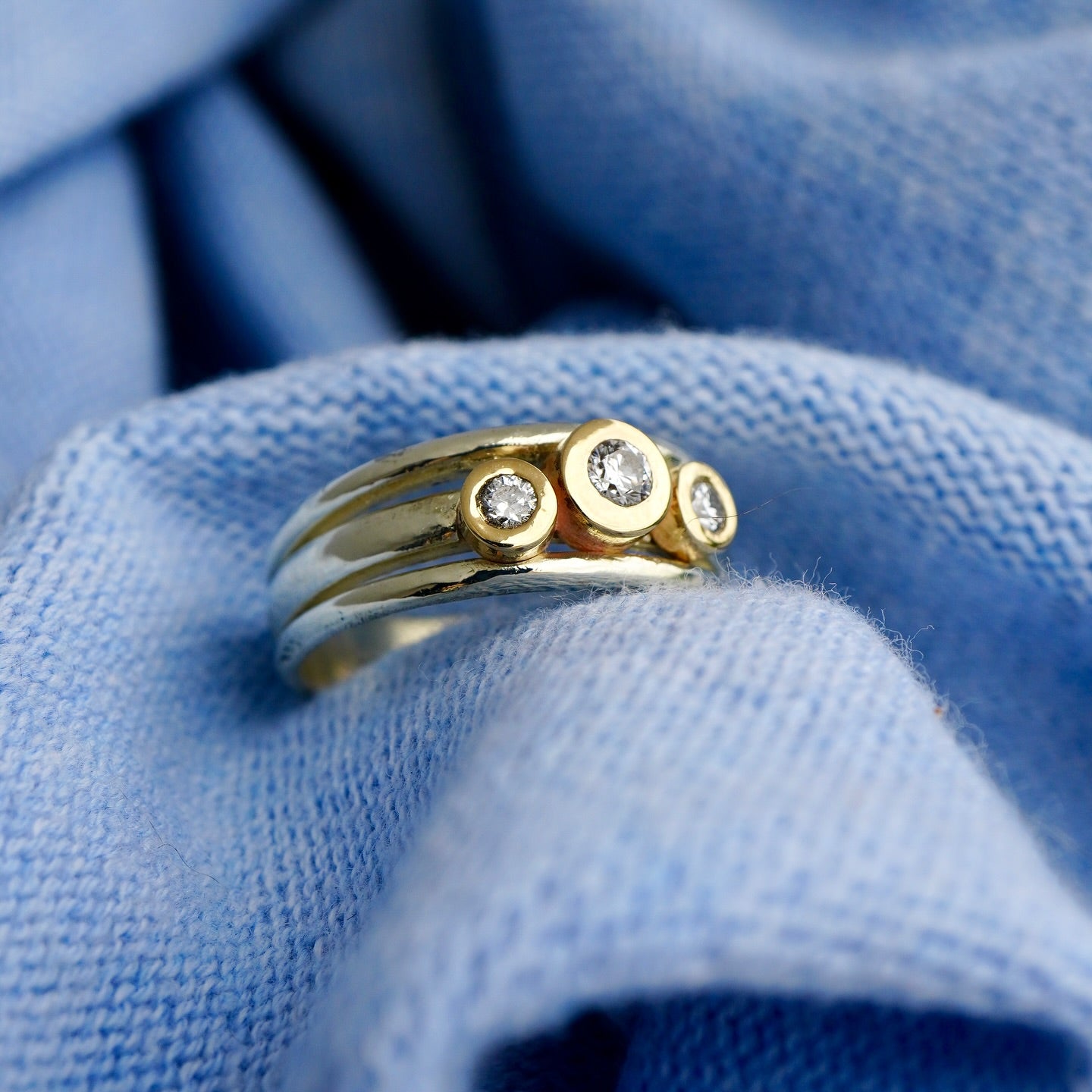 This ring has bigger diamonds than the standard Cariad ring - in fact, they're the same size as the Maxi-Cariad. I've hand-picked two 2.5mm diamonds and one slightly larger 3mm gem, nestling them into rich, golden nuggets, offset for a striking contrast. Understated but full of character: this is Cariad, reimagined.
