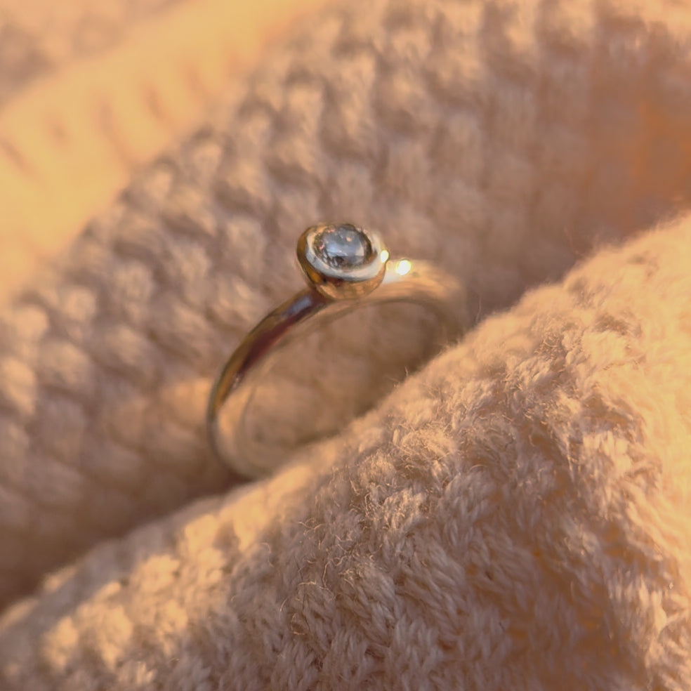 Right in the centre sits a 4 mm diamond, tucked into a hand-shaped gold setting that gives off the warmest little glow. The silver and gold together make the diamond pop in such a lovely way, almost like it’s lighting up from the inside.