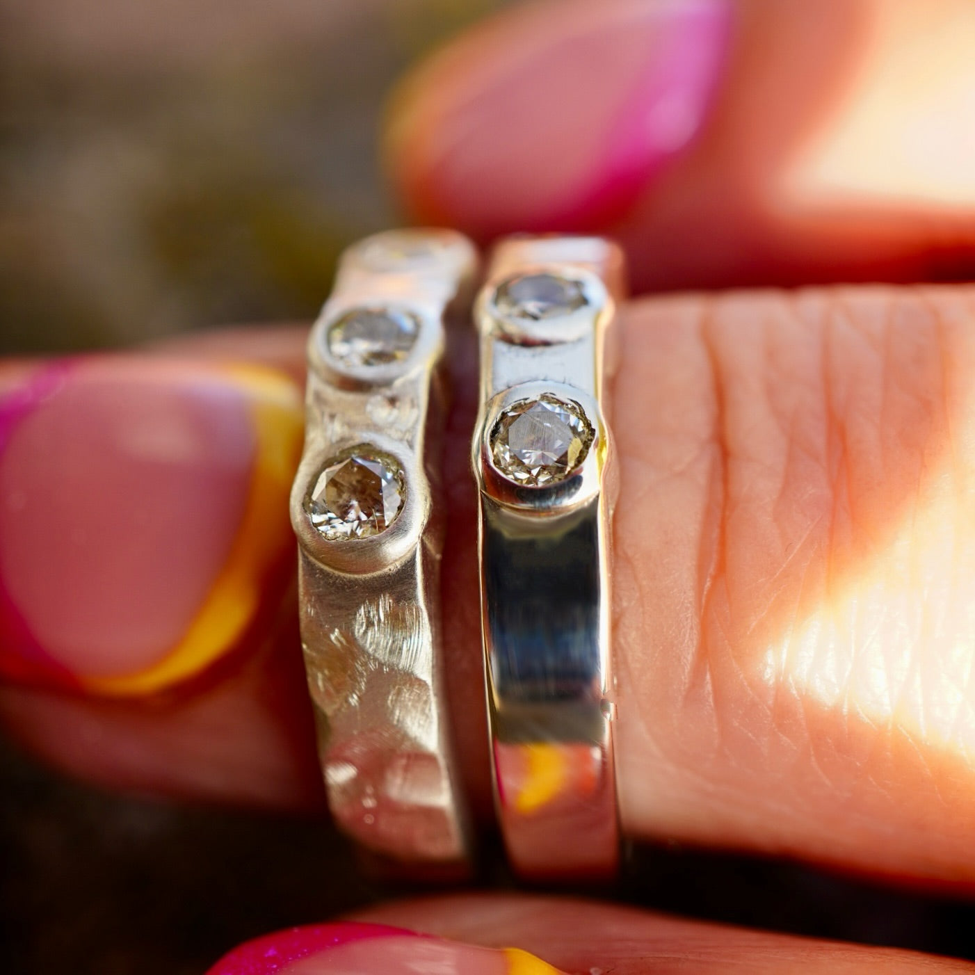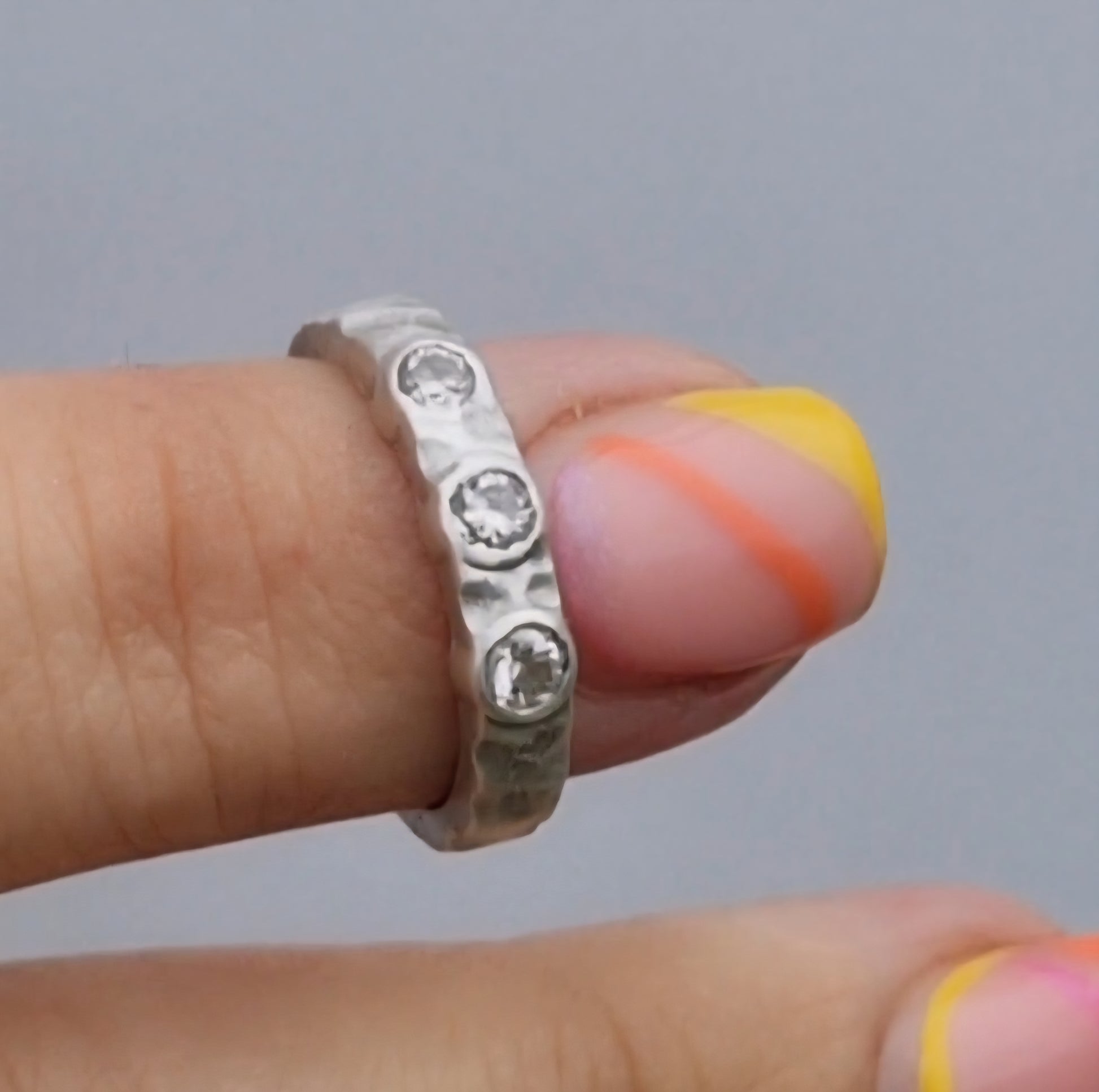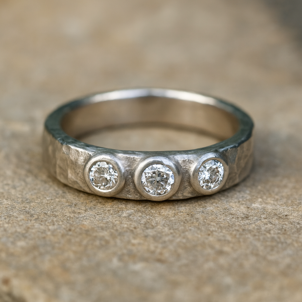 Texture, sparkle, and simplicity all in one. This ring is handmade in sterling silver, with either a hammered matt surface that catches the light in every direction, or a flat, shiny mirror finish. Set into the band are three brilliant 3mm diamonds, each one flush-set for a sleek, modern finish that’s as practical as it is beautiful.