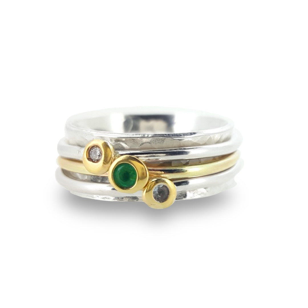 Around a broad 10mm wide band of sterling silver, I attach three spinning rings - two of silver and the centre ring of solid 9ct gold. Each of these rings holds a nugget of solid gold, which in turn holds a sparkling gemstone.