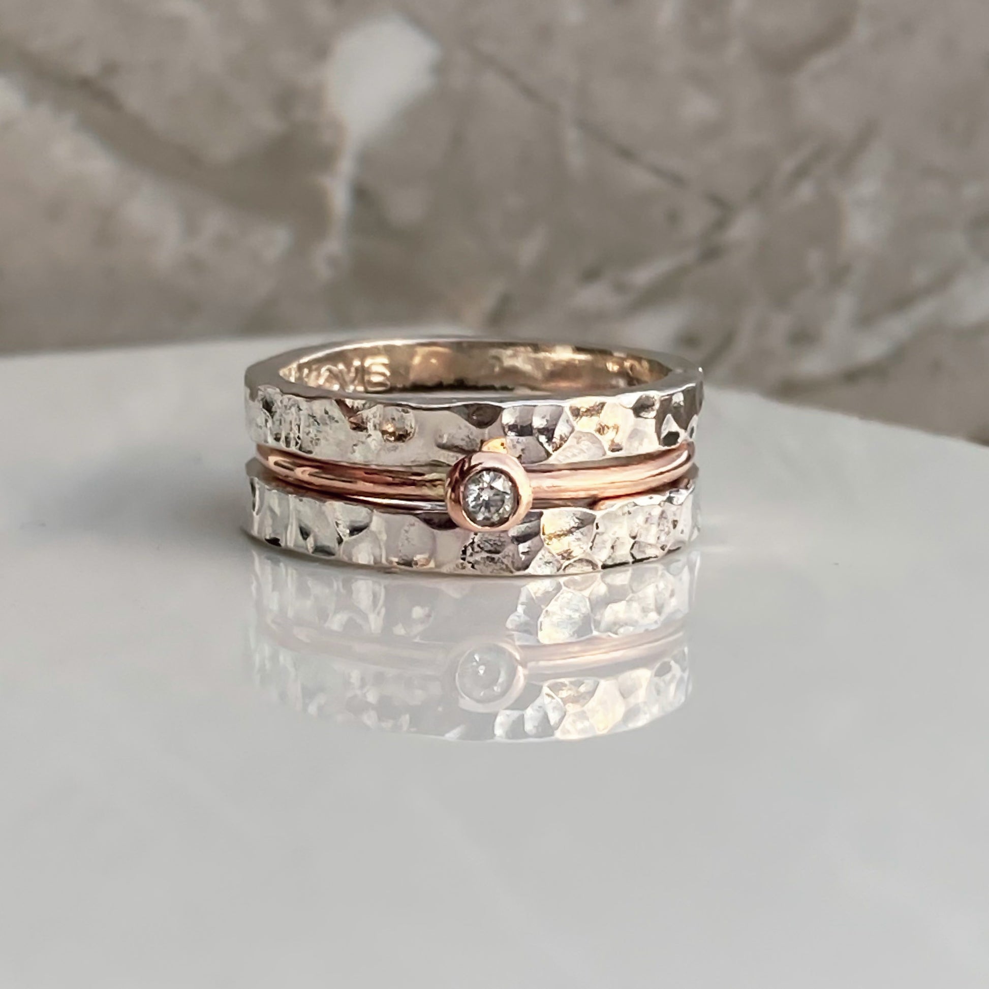 Enjoy this unique and contemporary stacking ring set, highlighted with a diamond in a solid gold setting. Handmade in my Leeds studio using only traditional precious metal techniques, this adorable three ring stacking set is made to order for you.