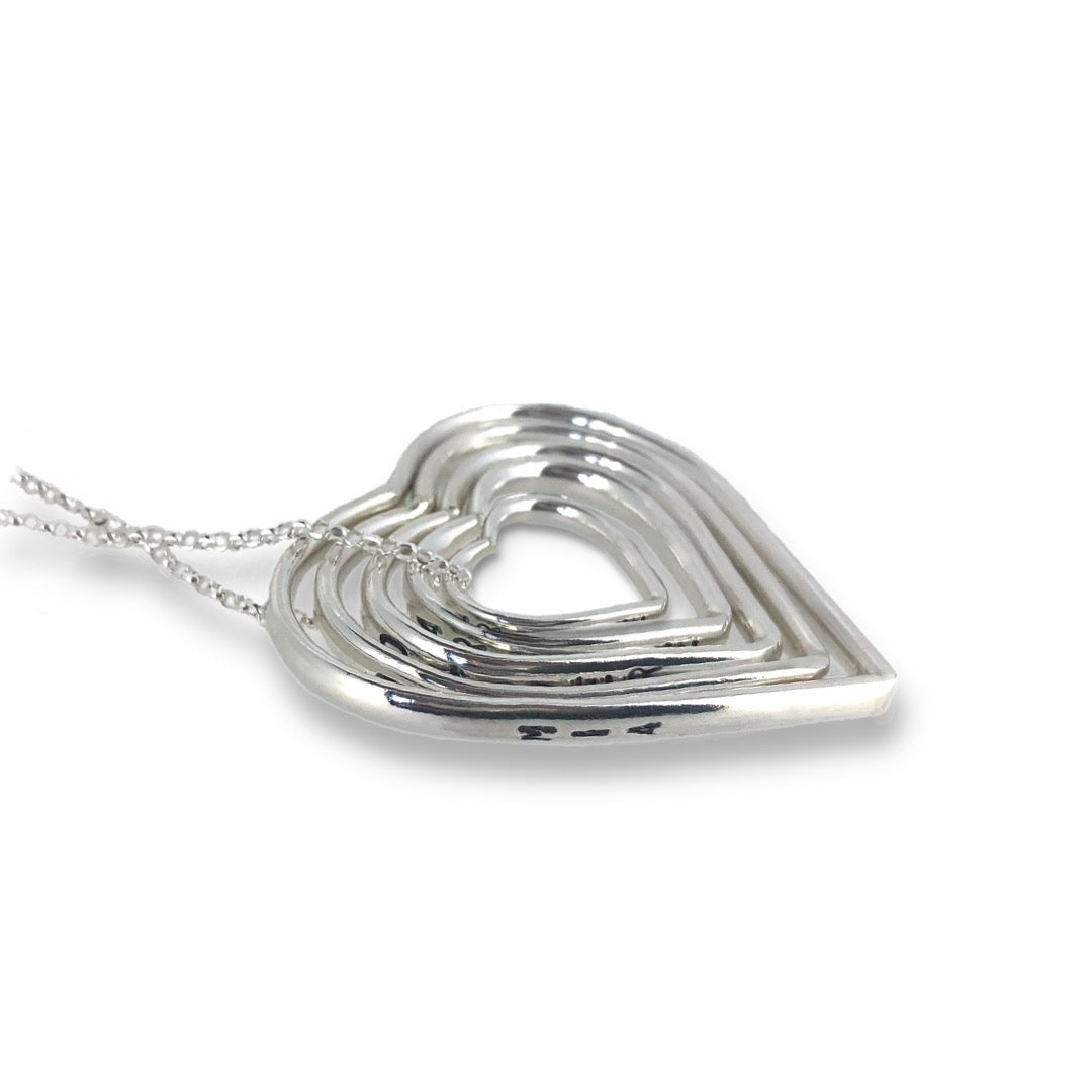 I make hearts of shiny solid silver, and hand-stamp down the sides with something that is important to you - a name, a date, it's down to you - this is YOUR necklace!