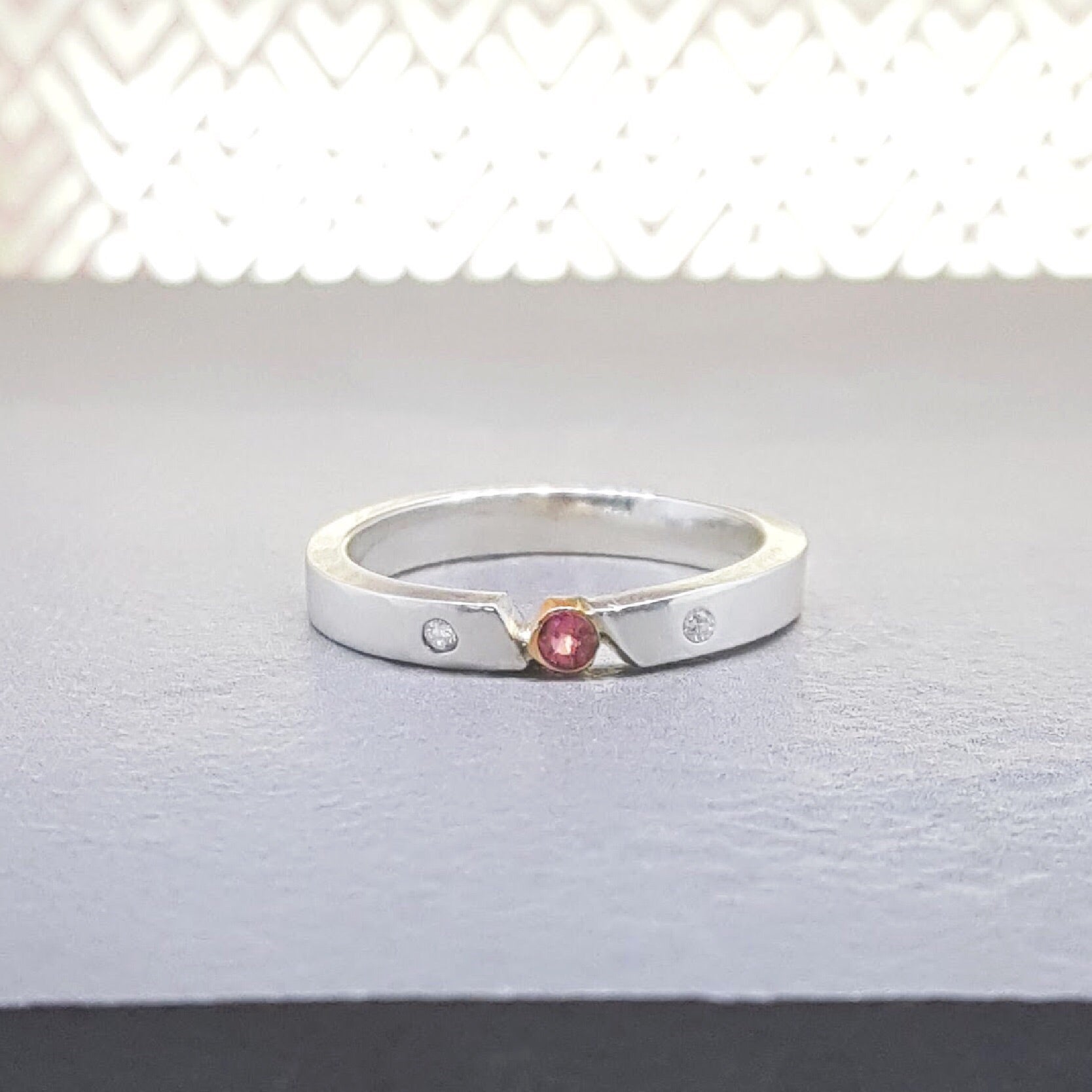 This stunning ring is contemporary and unique, and sure to get you noticed. I designed this piece on the hottest day of the year, and I'm sure it's captured a tiny bit of the sun in its gorgeous sparkling pink sapphire. I then set the stone in a solid 9ct gold bezel setting.