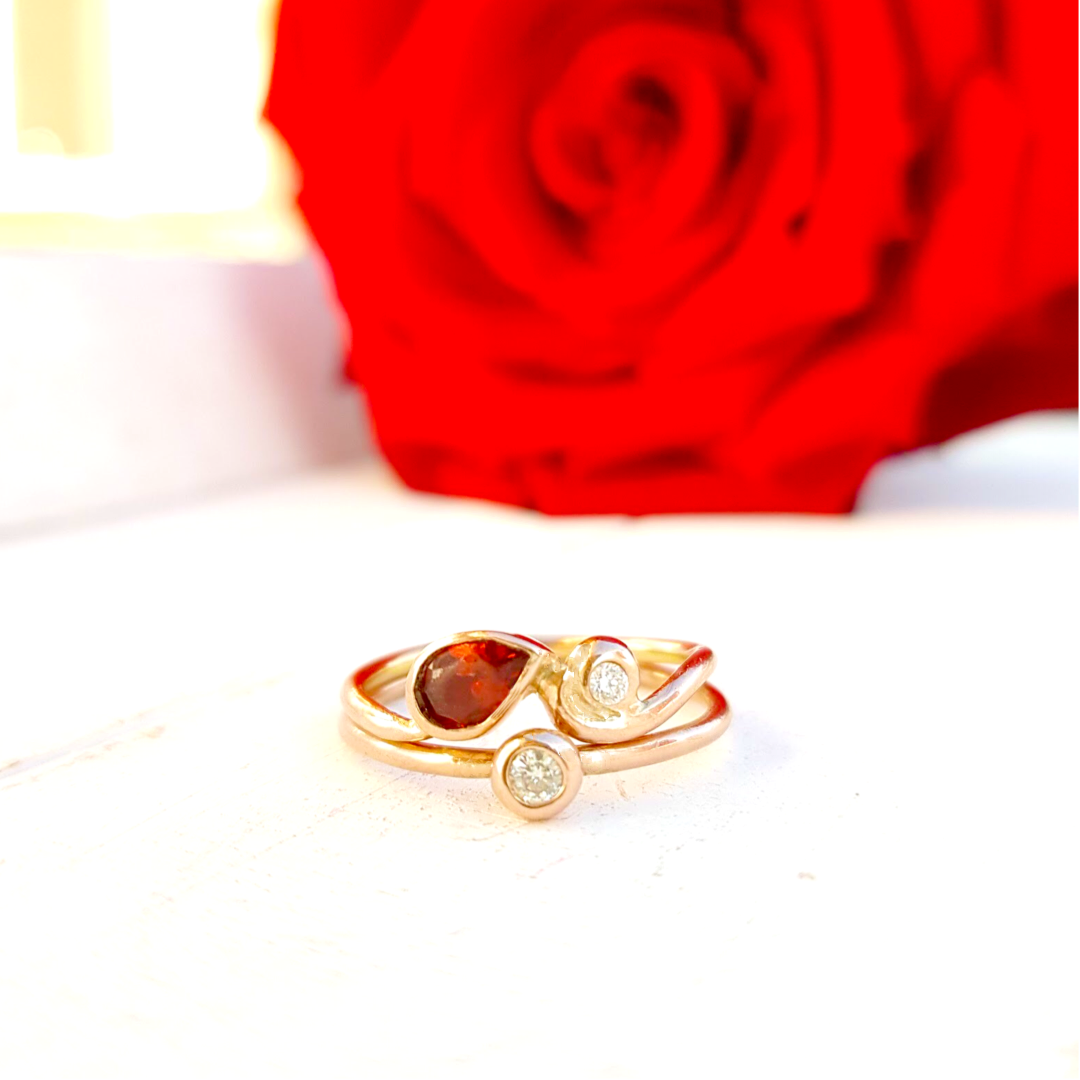 A duo of narrow, pure 9ct gold bands slide on to your finger, complemented with a glowing garnet and two sparkling non-conflict diamonds.