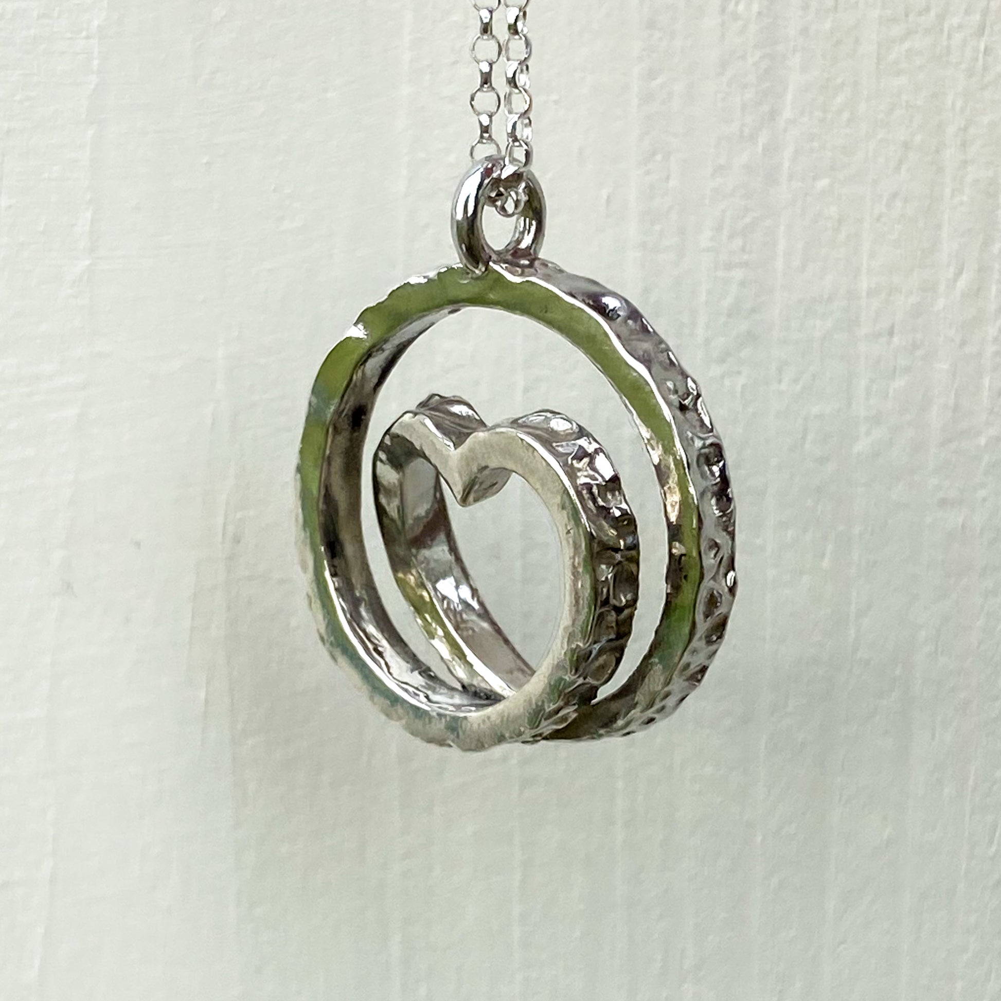 The pendant is handmade from solid sterling silver, with a heart inside a larger circle in one continuous loop. It measures about 25mm across so you can wear it with anything and comes with your choice of short, medium or long chain. I can also give it a hammered finish too if you want it with a bit more character.
