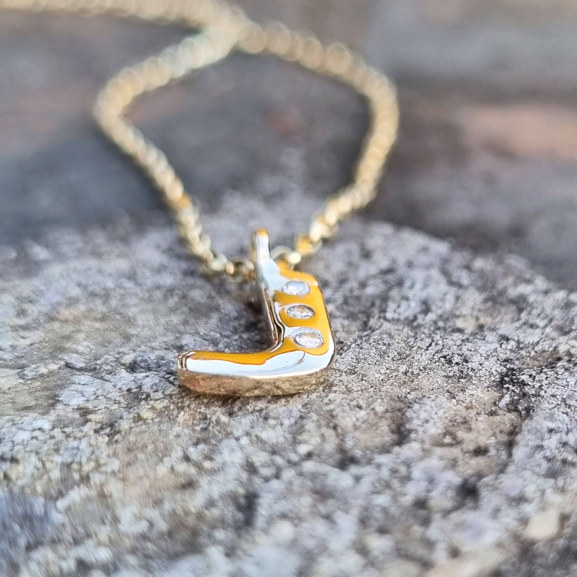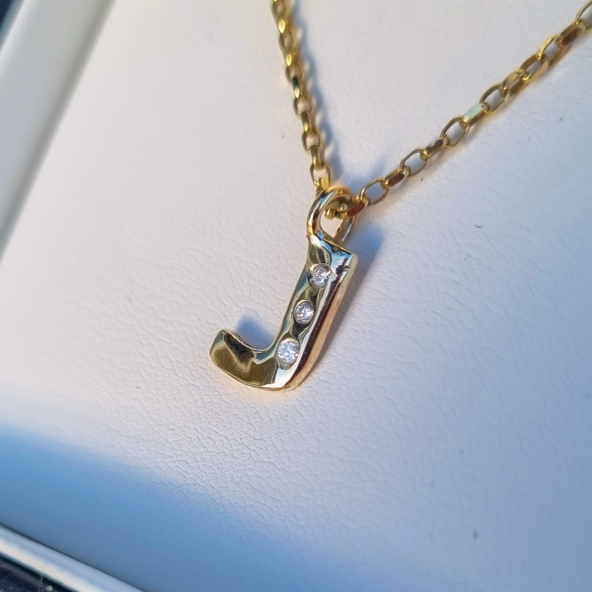 I hand-craft each single letter using a sleek, modern font, sawing the design from 2mm thick metal - either solid sterling silver or 9ct gold. I then pop a cheeky diamond or two (or even three) for a bit of sparkle.