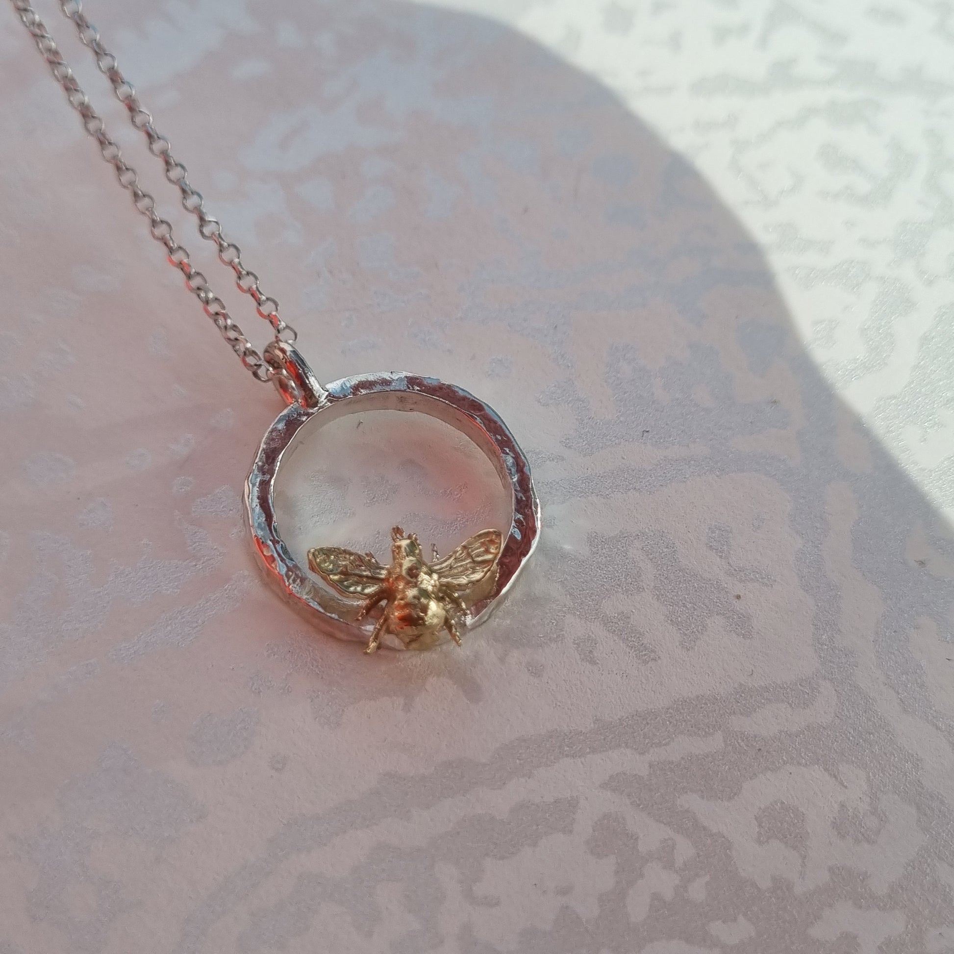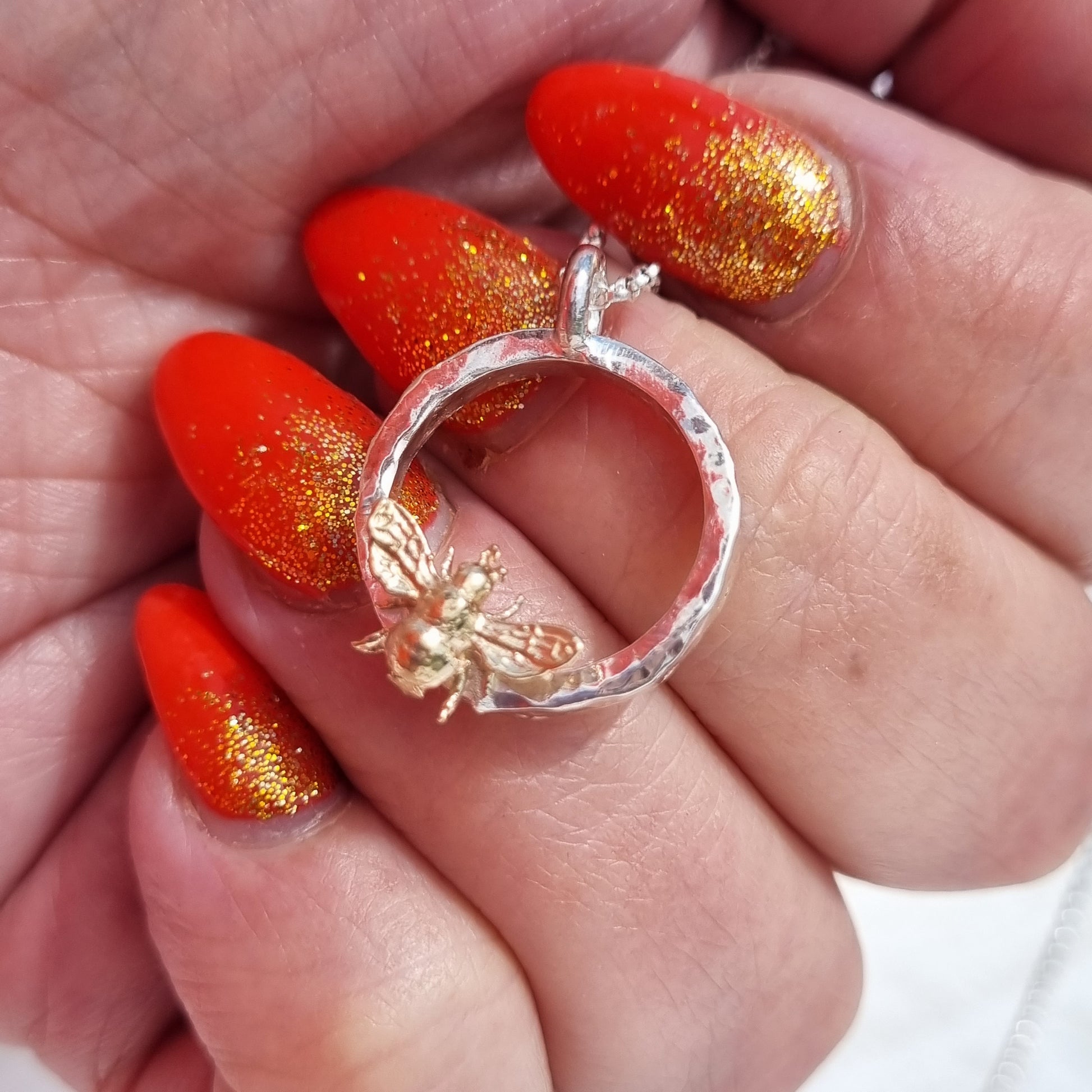 Special listing - Silver halo with tiny solid gold bee - necklace
