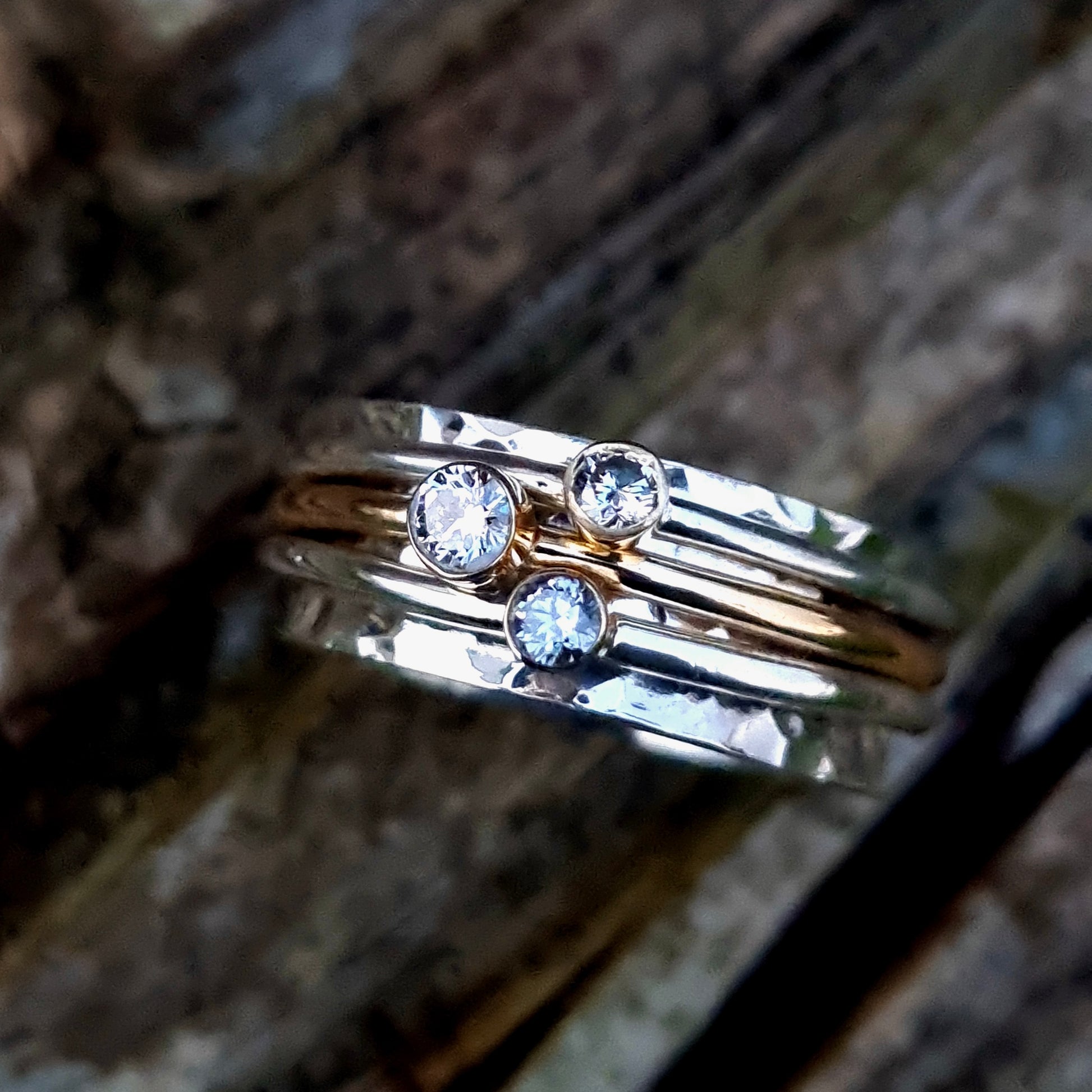 I've hand-selected two 2.5mm diamonds and a whopping 3mm diamond for the centre band, and mounted them in solid 9ct bezel settings on the skinny rings - The bezel settings are thinner than the nuggets used in the radiational and mini Cariad, to make the diamonds appear even larger. Check out the picture and admire how well they go together.