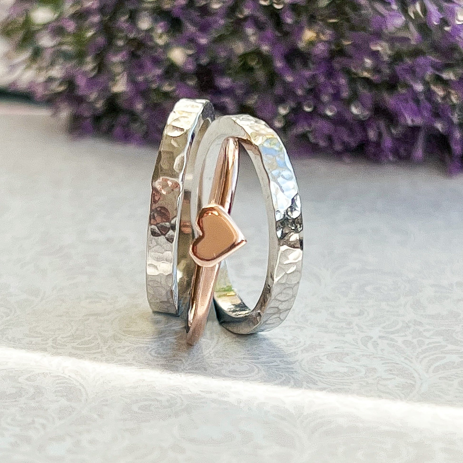 Enjoy this unique and contemporary stacking ring set, in precious metals highlighted with a hand-carved solid gold heart.