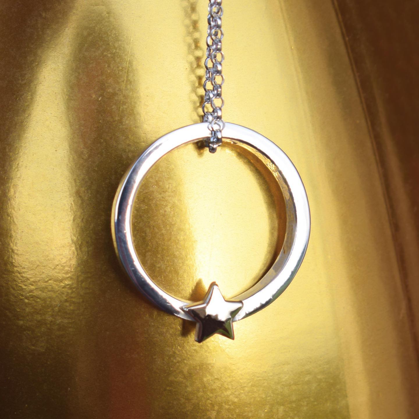 I hand hammer a halo from solid sterling silver with dimensions of 2mm deep and with a diameter of 1.5cm. I then adorn the halo with a gleaming star hand-sawn from solid gold. You can even add a 1.5mm diamond to the centre of the star for a bit of extra sparkle!