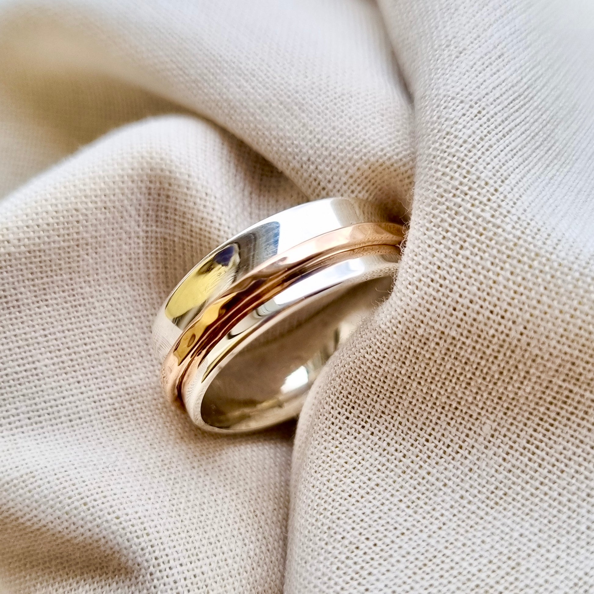 Spinning around this flawless band is a separate ring made from solid 9ct gold. This spinner is hammered lightly giving contrast to the lustre of the mirrored silver band inside. I can make this spinner tight, loose or even soldered in place.