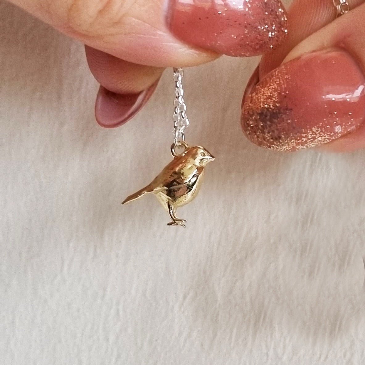 You can choose the length of your belcher chain when you order. Some people prefer the chain to be made from the same metal as their robin, either solid sterling silver or solid 9ct gold, and others prefer to mix and match. I can also add a solid 9ct gold tag that's hand-stamped with my heart logo and an initial on the back - That will officially make him part of my Gold Tag Menagerie! If you want an initial on the gold tag, just let me know in the 'extra info' box when you order.