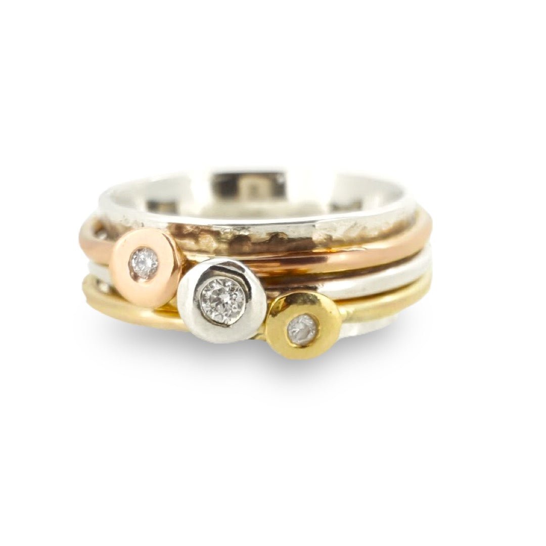 Set on a wide 9ct white gold band, hand-hammered for a subtle lustre, are three gorgeous diamond-set spinning rings. These graceful rings are handmade from solid white gold, rose gold and yellow gold. These spinning rings hold solid gold nuggets, which in turn are set with sparkling diamonds - two 2mm diamonds and one of 2.5mm.