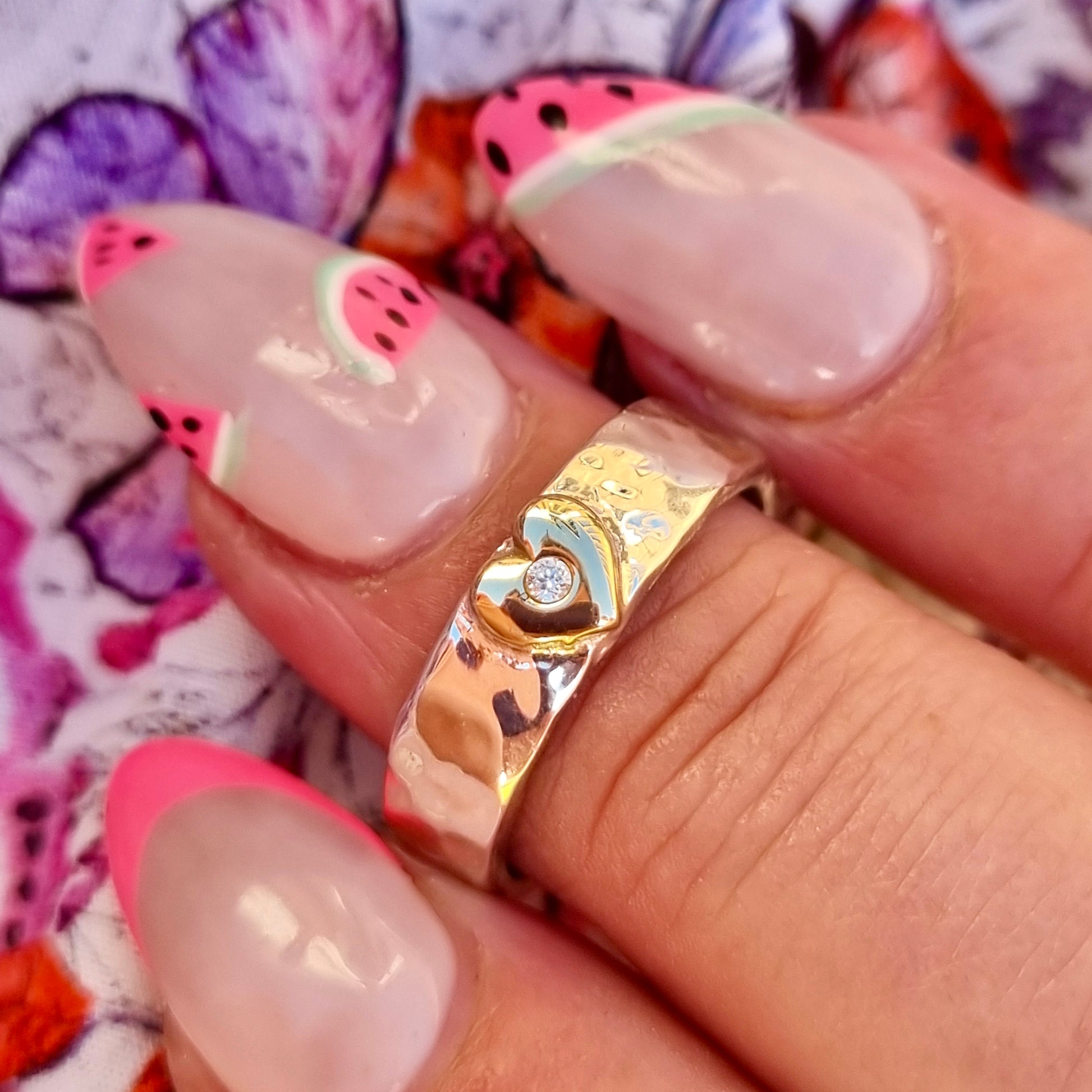 'Be Mine'. Charming hand hammered sterling silver ring set with solid gold heart.