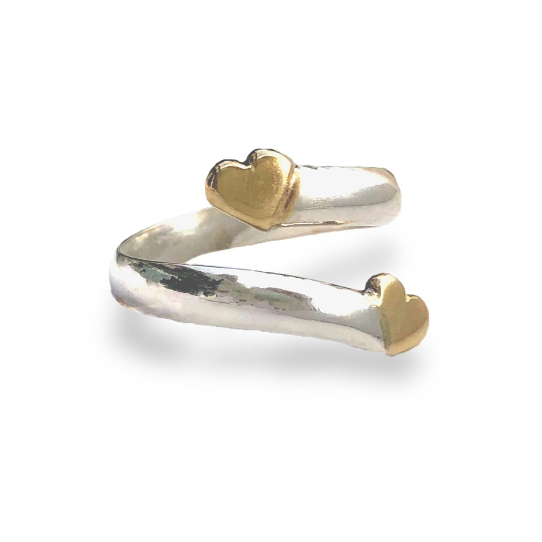 Set on a 4mm wide spiral of solid sterling silver, each end of this dainty twist ring is adorned with a gleaming heart of solid 9ct gold.