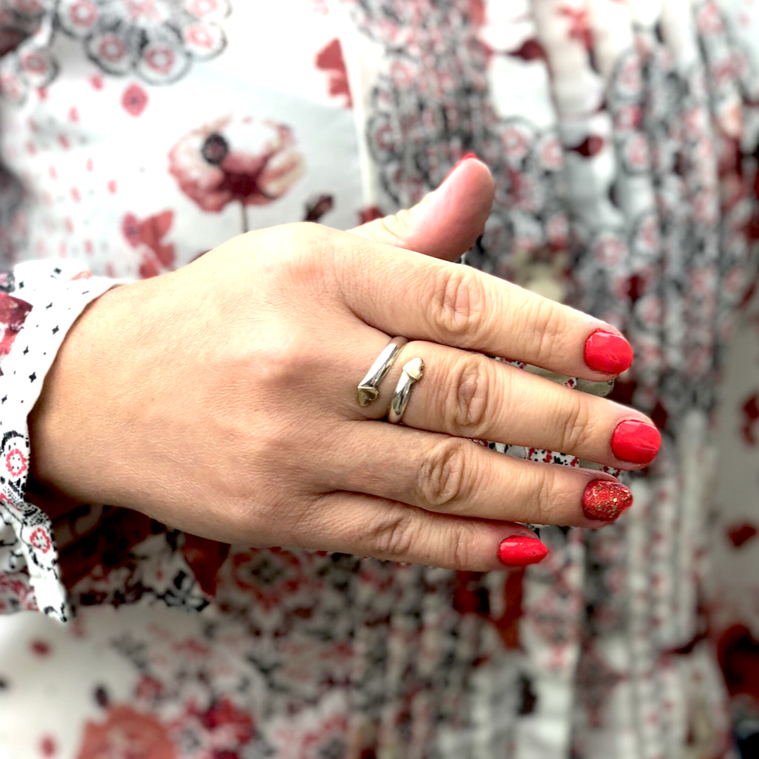 The silver band is artfully hand formed and then combined with two contrasting gold hearts, each one hand-cut to add that subtle glow that only gold can.