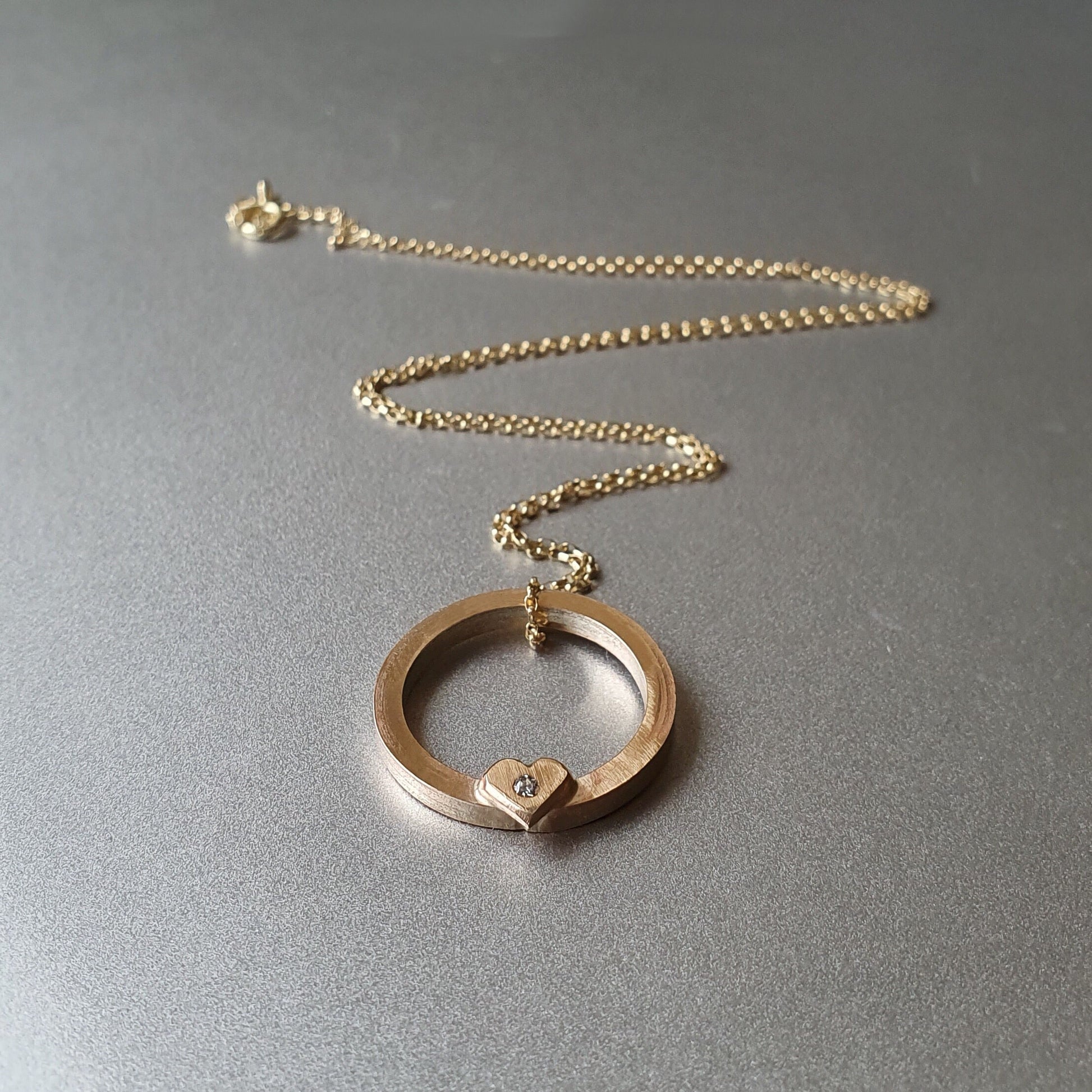 This simple and elegant necklace is the perfect accompaniment to my ‘one love’ spinning rings or a great necklace to wear on its own for a subtle sparkle. I hand-form a halo from solid 9ct gold with dimensions of 2mm deep and with a diameter of 1.5cm. I then adorn the halo with a gleaming heart hand-sawn from solid gold and pop in a cheeky 1.5mm diamond