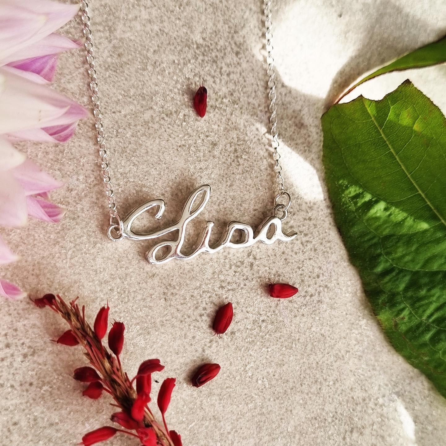 Upload a photo of the writing when you order, and I will scale it onto a pendant - 3cm wide for up to 6 letters and 5cm wide for up to 12 letters. If you want a larger or smaller necklace, just let me know and I'll figure out the best way of fitting it onto silver.