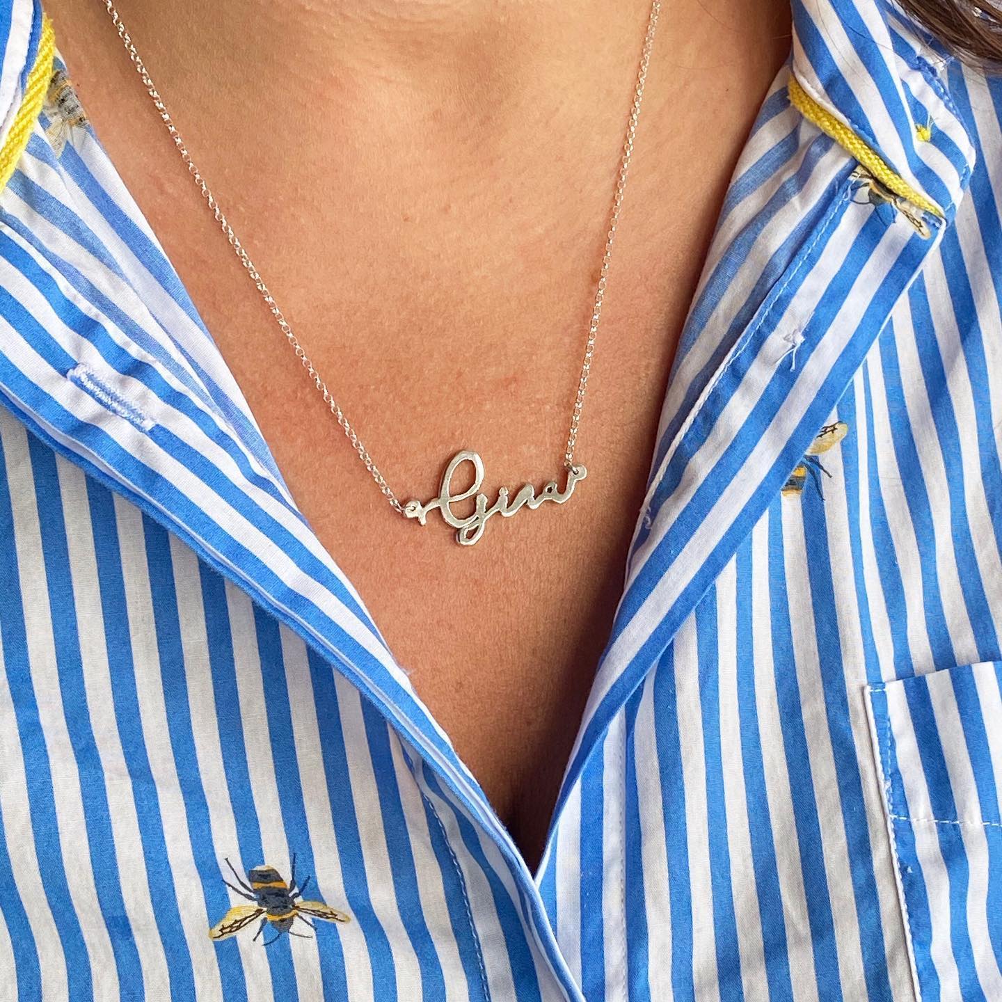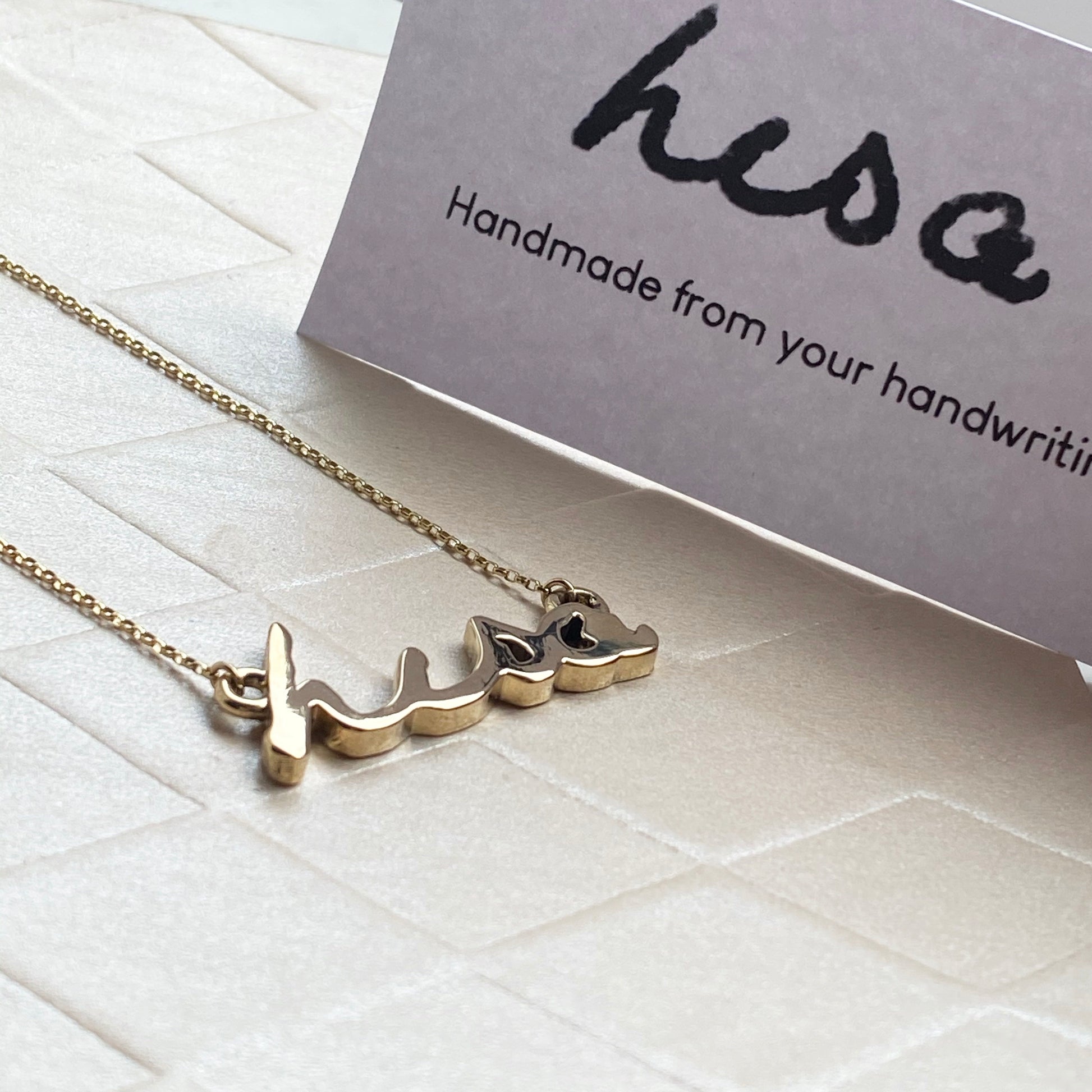 Just give me a word or two, written by your loved one in their own handwriting, and I will saw it by hand from solid silver or 9ct gold, before finishing it immaculately to make a truly personal necklace.