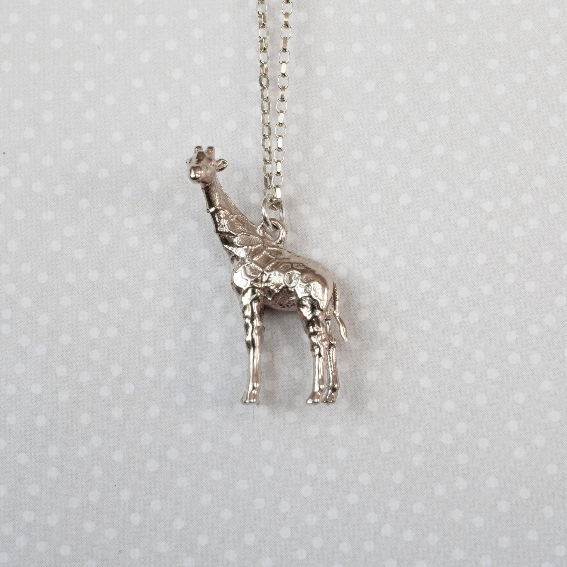 You can choose the length of your belcher chain when you order - it will be made from the same metal as your giraffe so either solid sterling silver or solid 9ct gold. I can also add a solid 9ct gold tag that's hand-stamped with my heart logo and an initial on the back - That will officially make her part of my Gold Tag Menagerie! If you want an initial on the gold tag, just let me know in the 'extra info' box when you order.