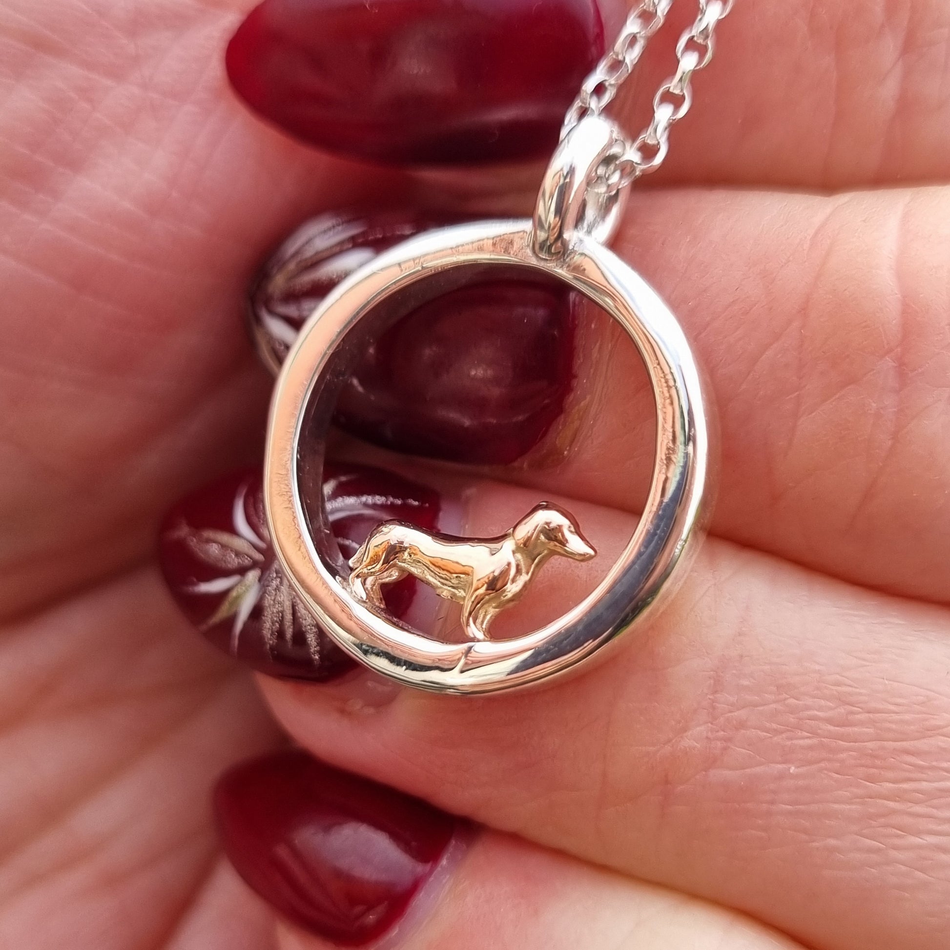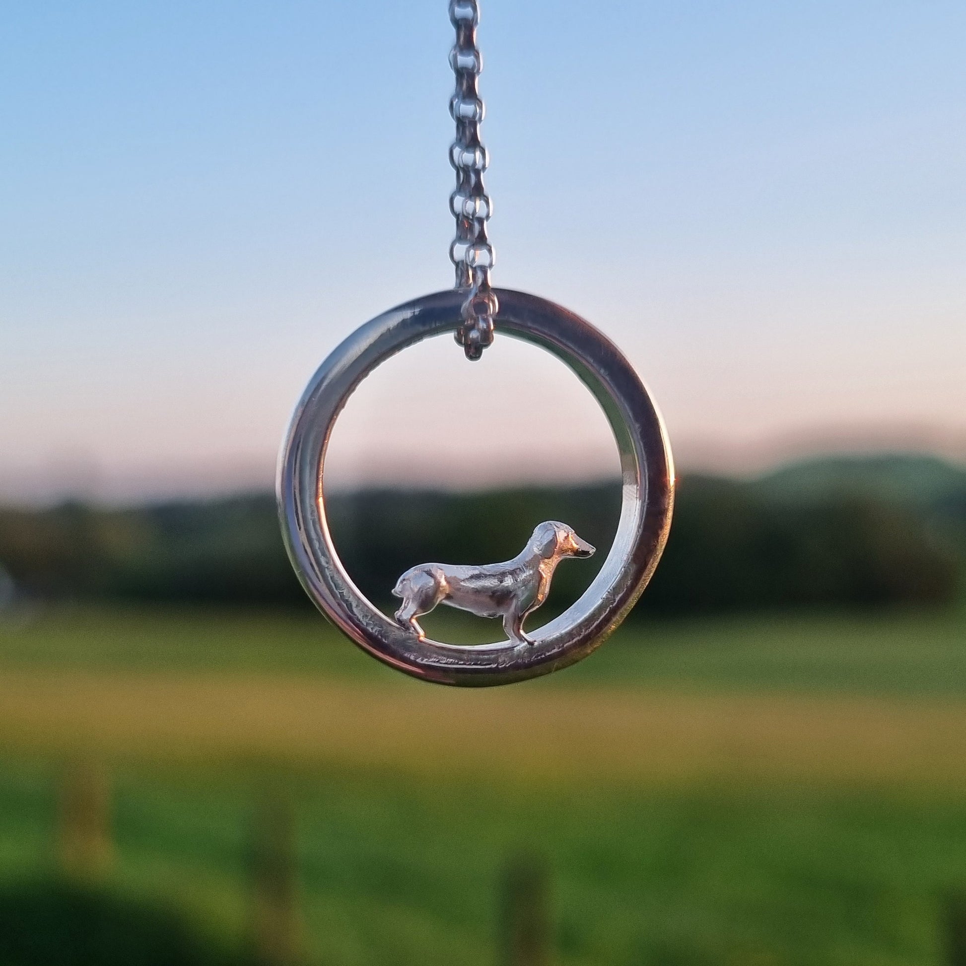 - Mini dachshund in the halo - silver, solid 9ct yellow or rose gold