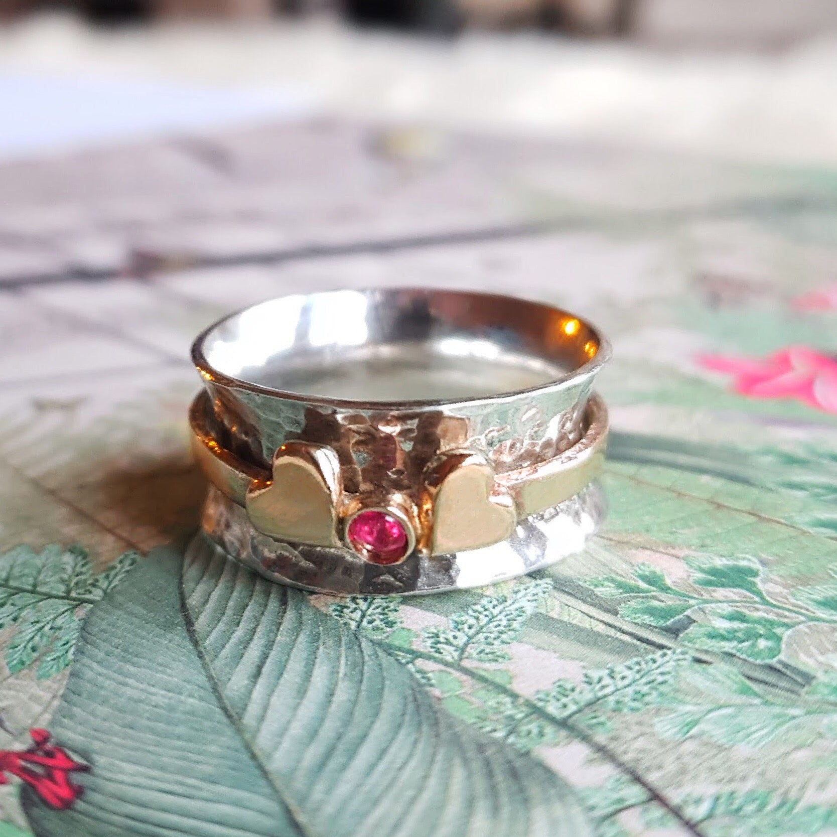 The silver band is artfully hand-hammered to produce a gentle sparkle, while the delicate gold ring bearing the hearts and gemstone can be freely spinning or fixed in place. Each of the hearts are hand-carved and unique, adding that subtle glow that only gold can.