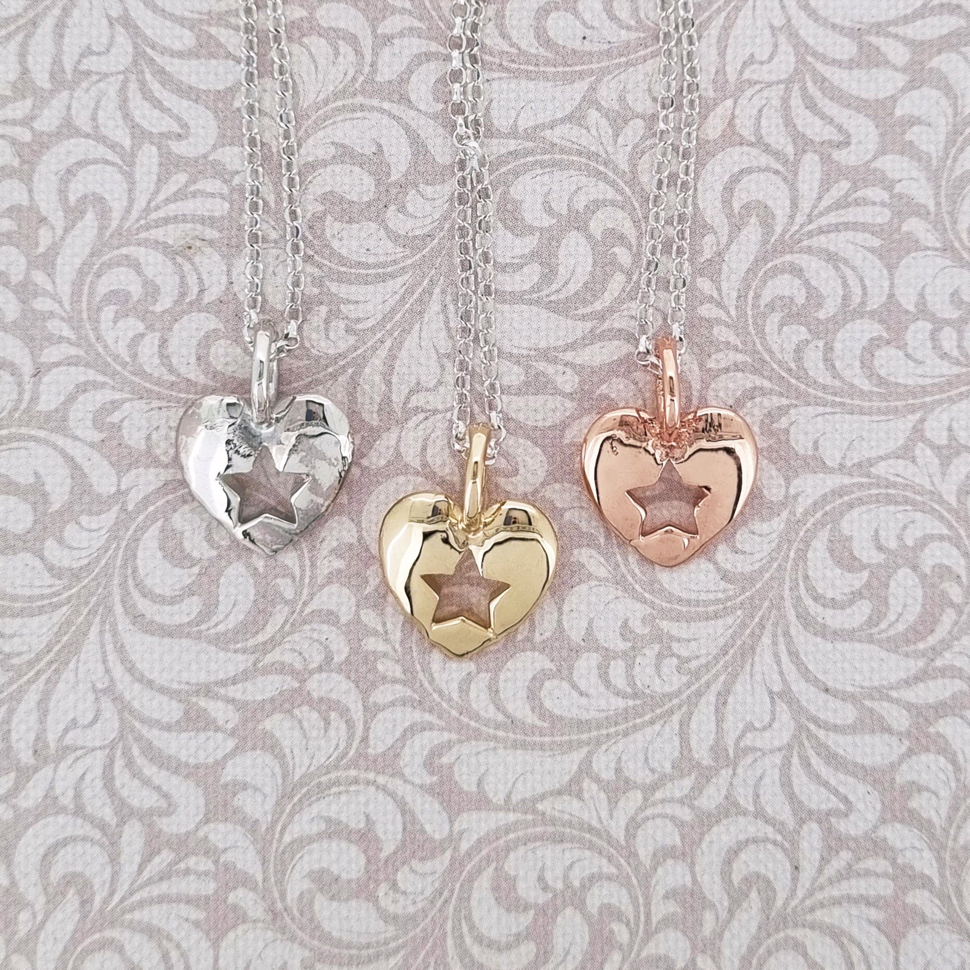 This gorgeous necklace is a 3D puffy heart, with a star cut from its centre. I can use solid 9ct rose gold, yellow gold or sterling silver, and it hangs from a sterling silver belcher chain.