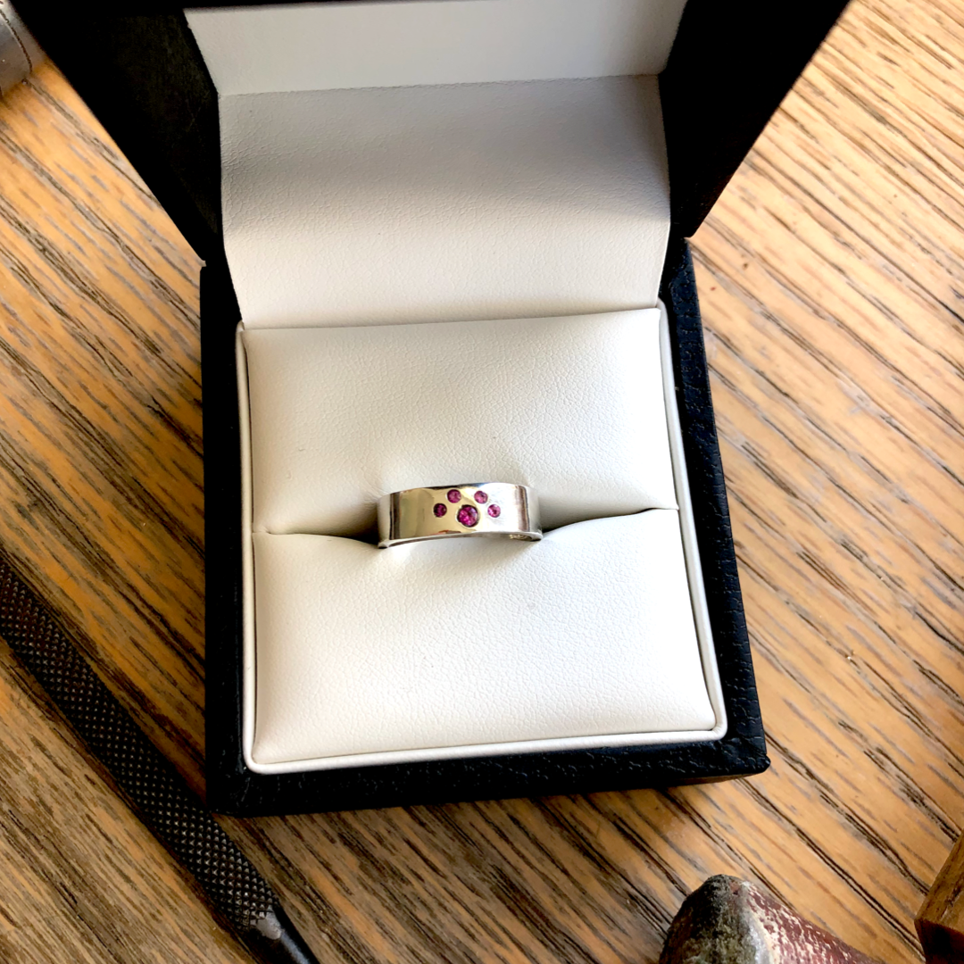 First I fashion a solid sterling silver band into a ring to your exact size, and skilfully burnish it to give a superb lustrous shine. Then I take your ring and inset five superb gemstones, one larger and four smaller, in the shape of your little pet's paw. What could be cuter than that?