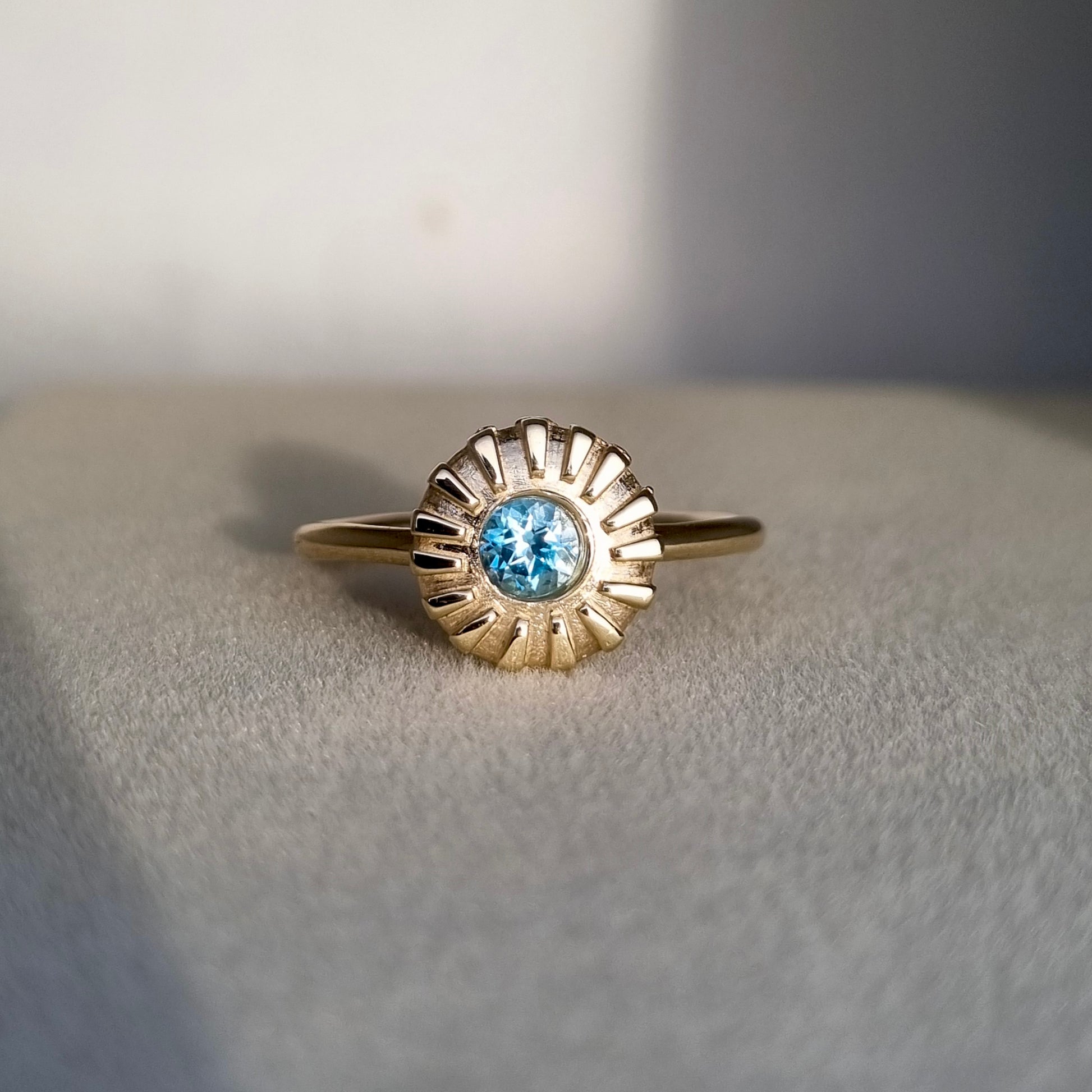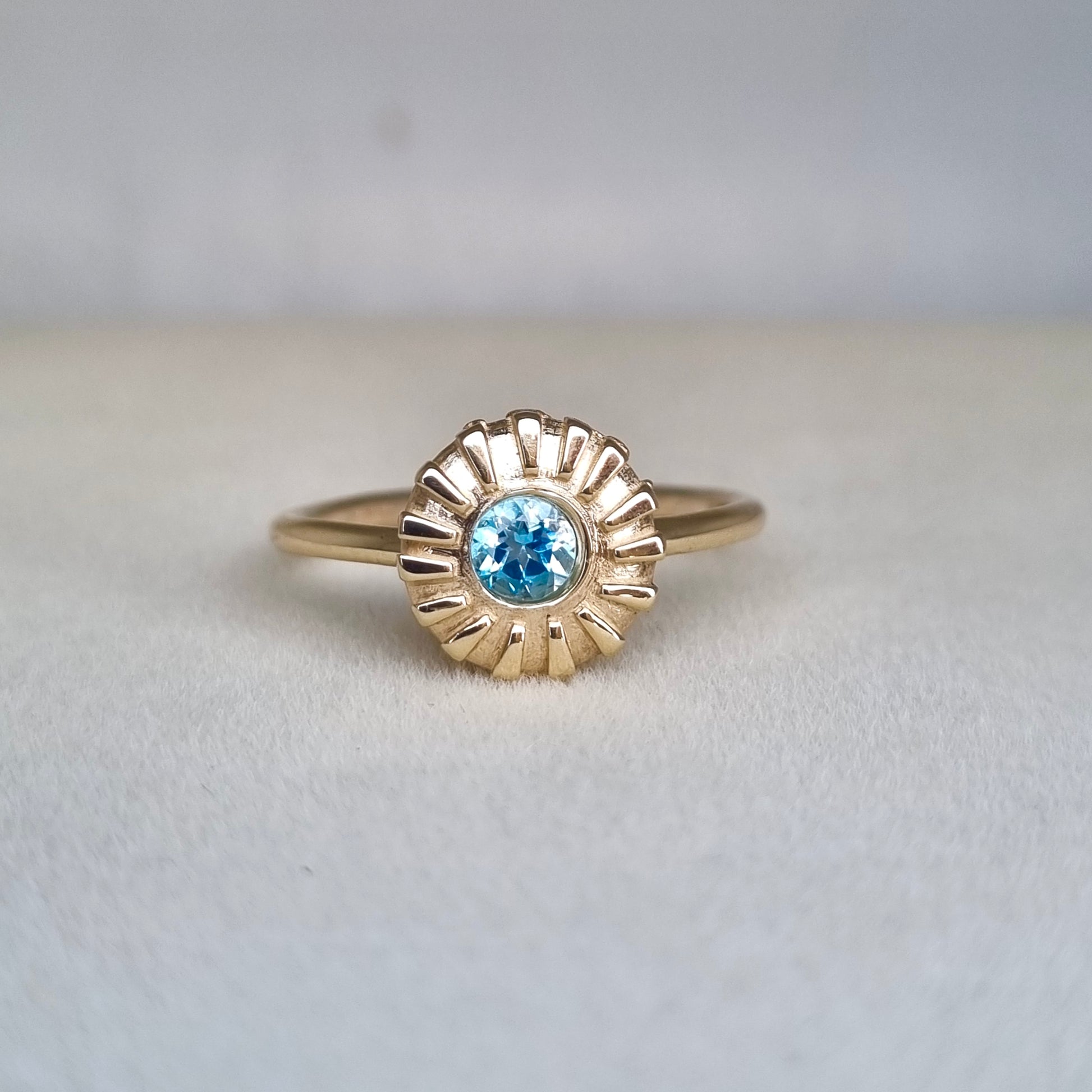 This glowing ring from my Sunkissed collection is handmade in 9ct yellow gold and set with a vivid 4mm Swiss blue topaz.