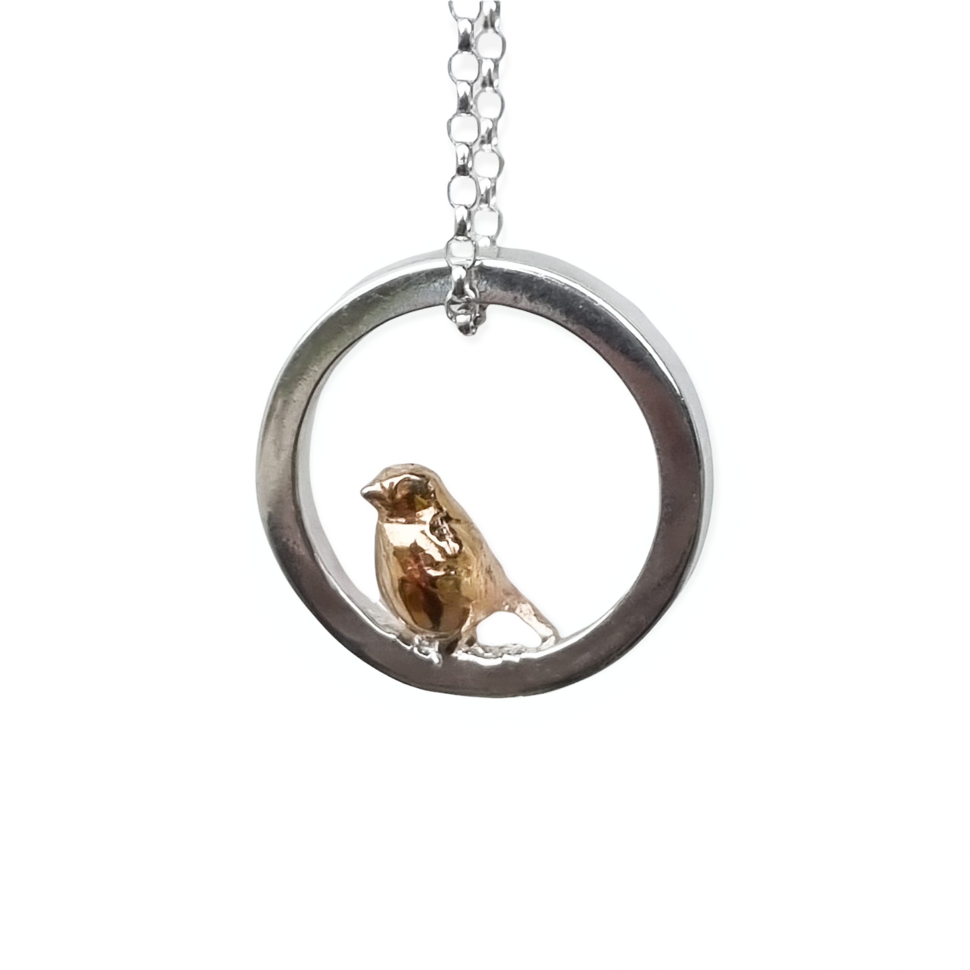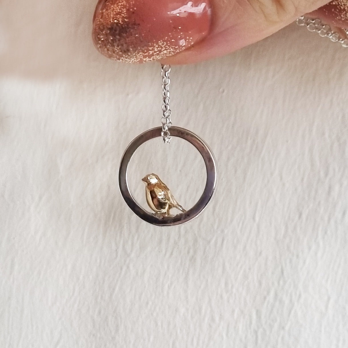A teeny tiny 9mm robin handmade from solid 9ct gold, peeping out from a solid silver halo with a gorgeous shiny surface.