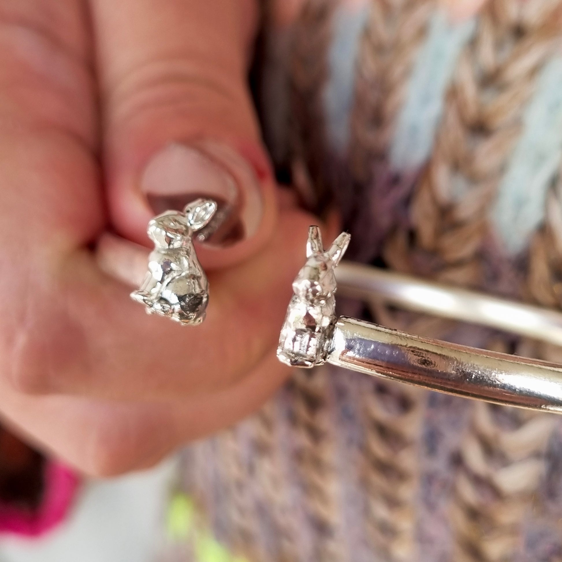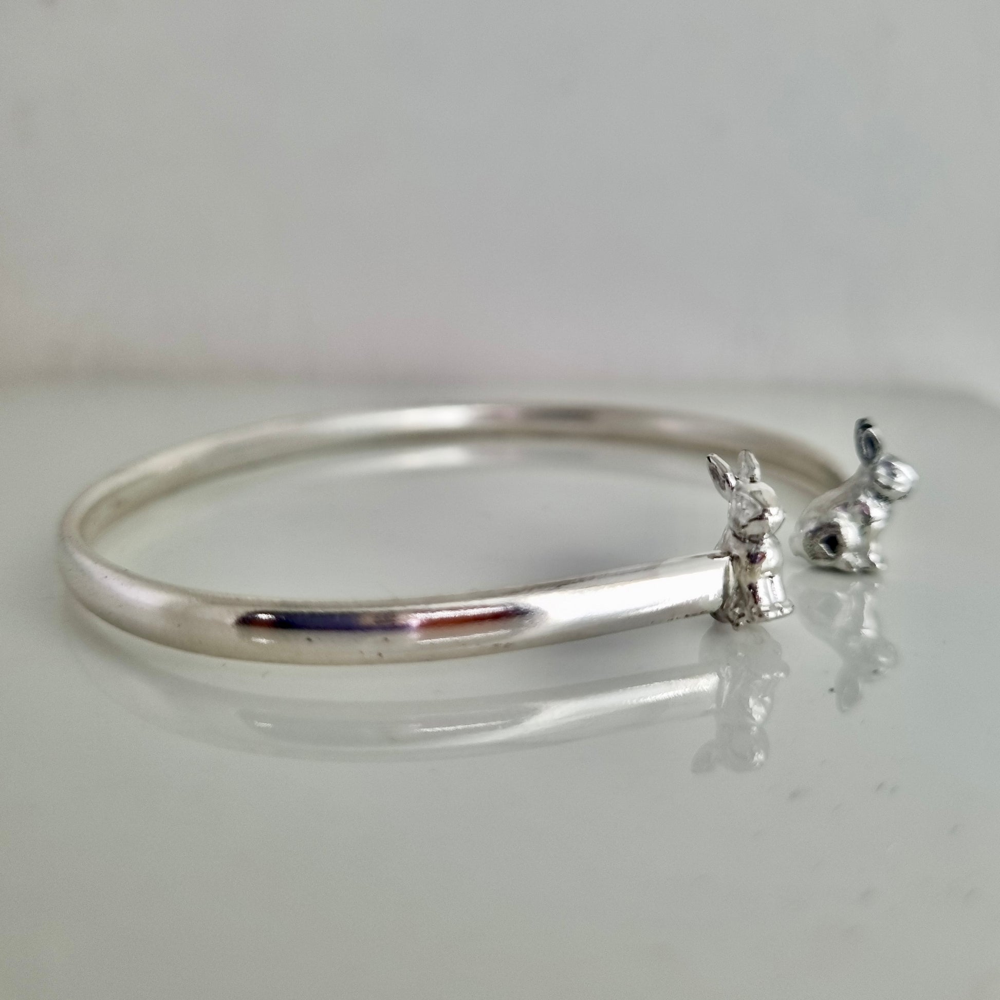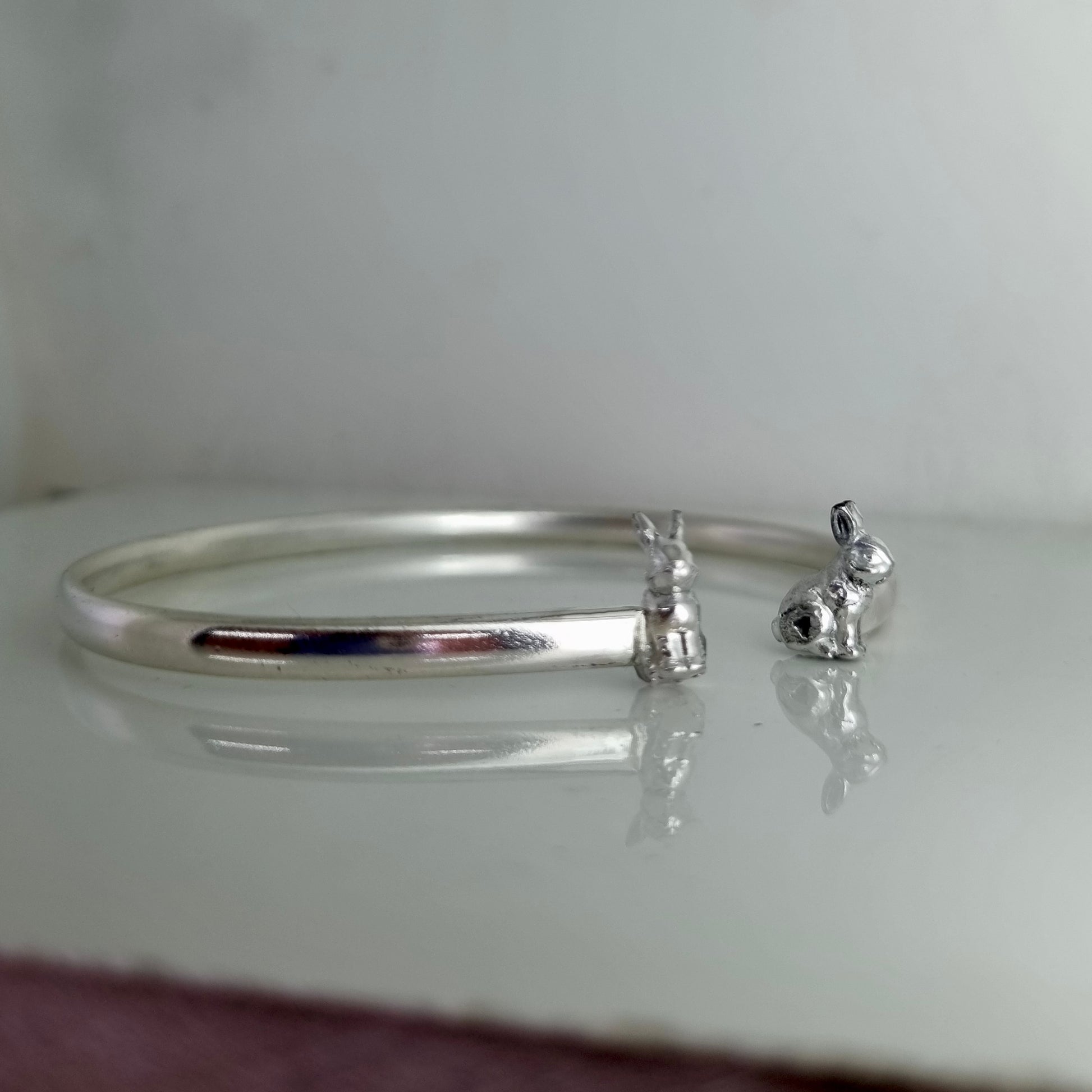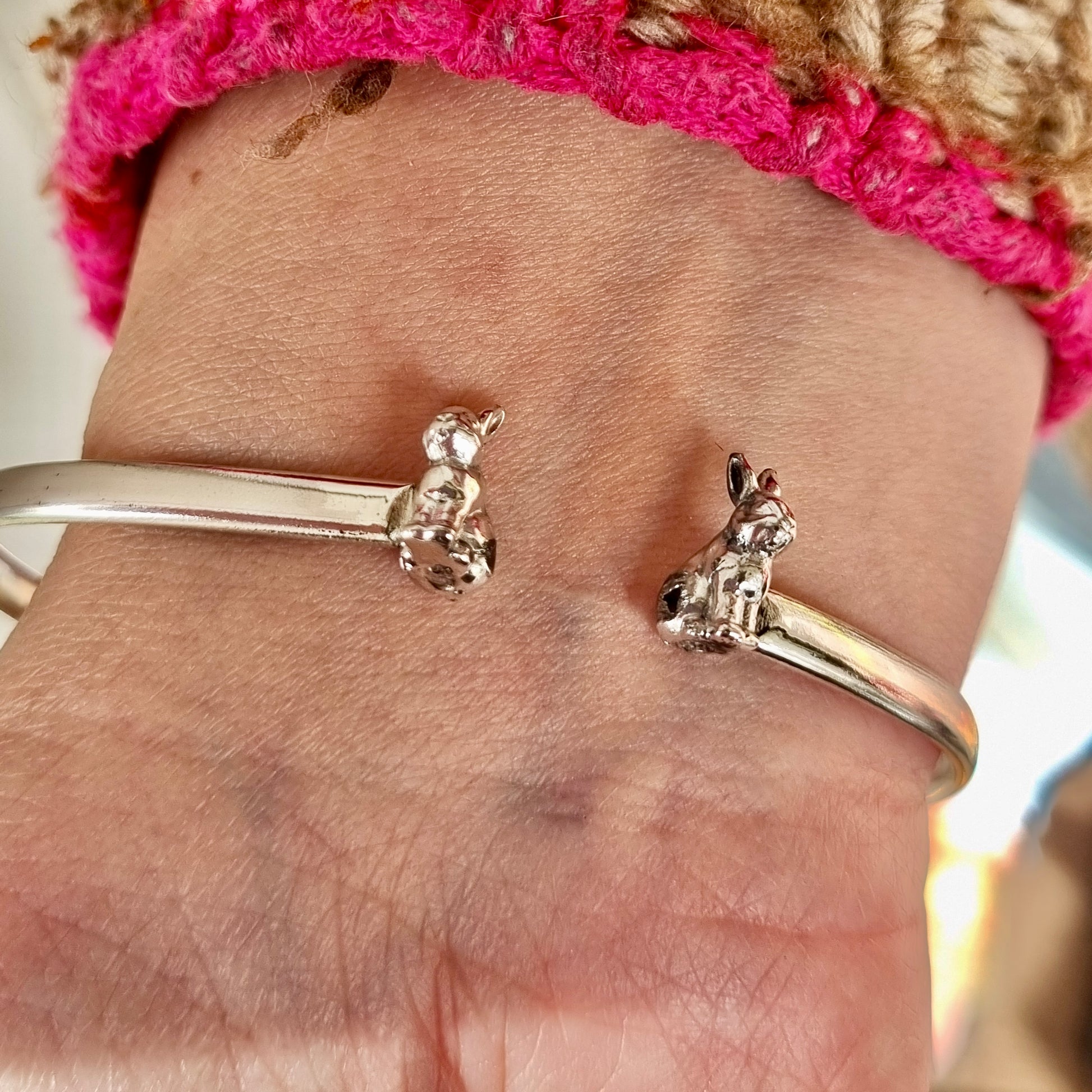 Celebrate the charm of whimsical design with my 'Bunny D' cuff bangle. This enchanting piece features two delicately crafted rabbits, one on each end of the bangle