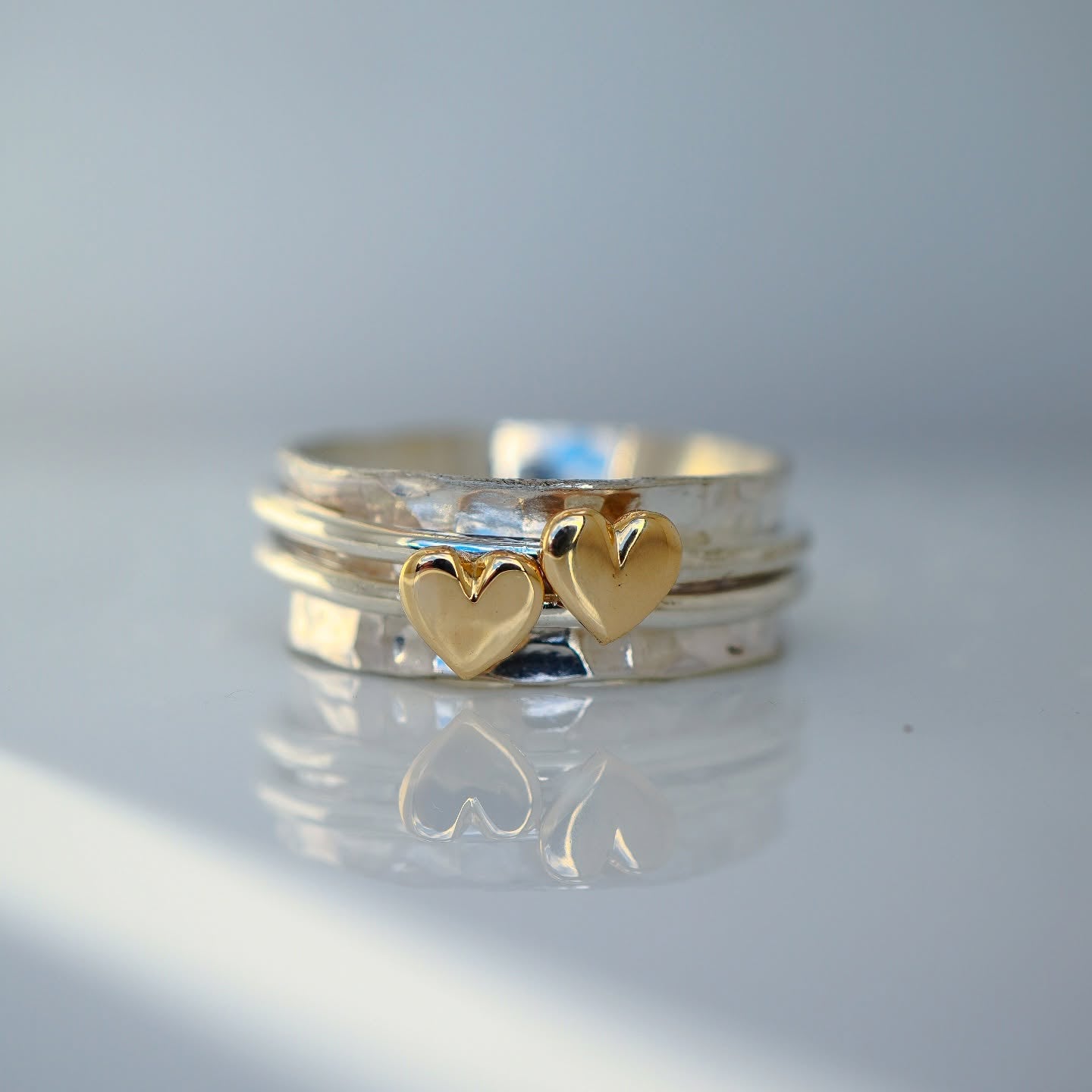 I artfully hand-hammer the wide band to produce a gentle sparkle, while the delicate spinner rings bearing the hearts can be freely spinning or tight around the inner band. These spinners come in sterling silver as standard, or you can upgrade to have the spinners made from the same gold as the hearts.