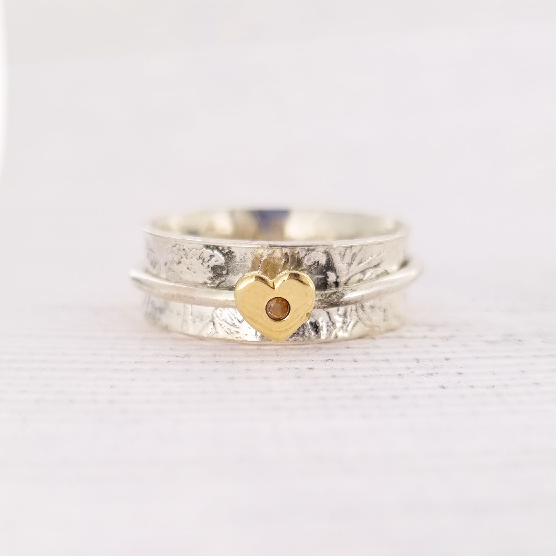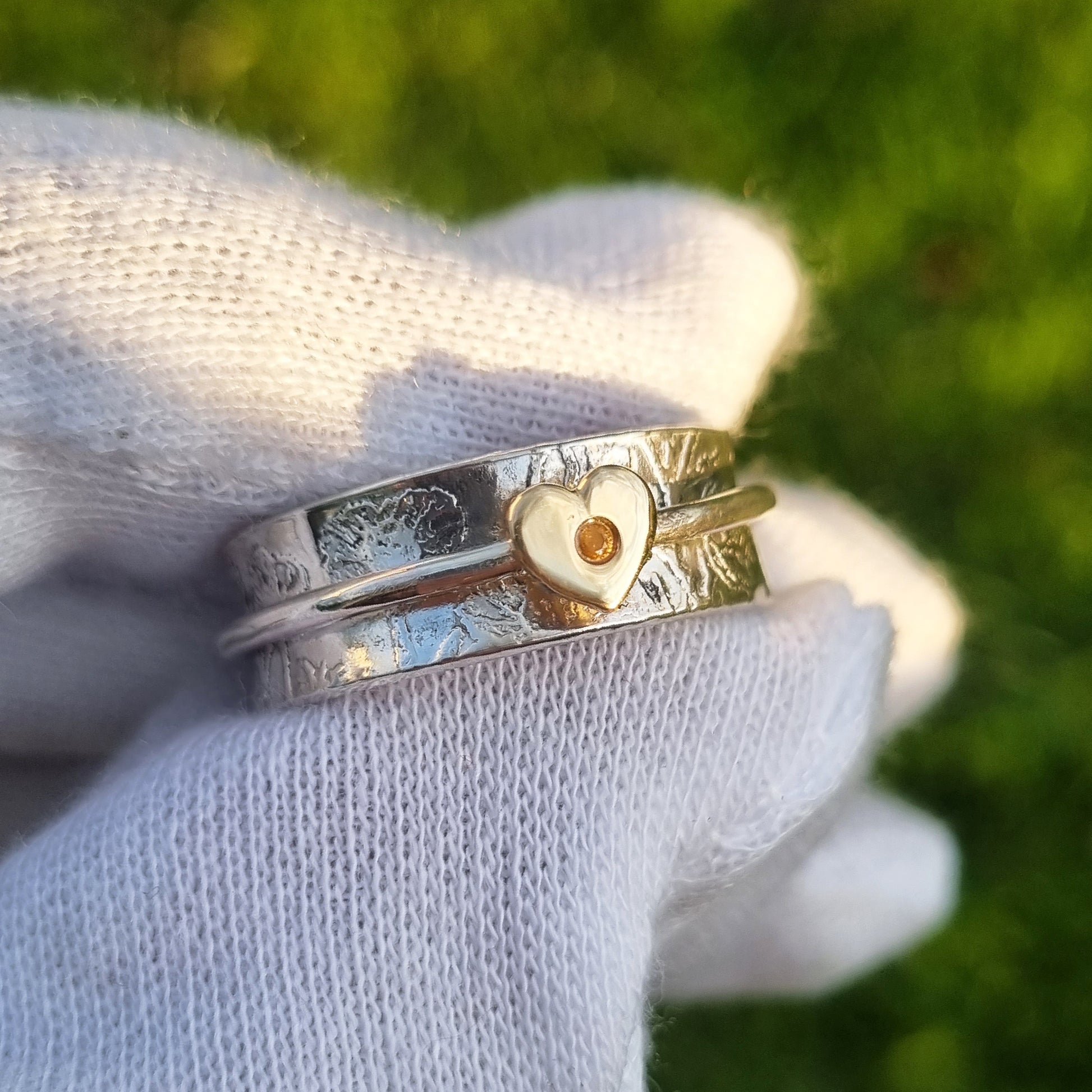 The main ring is solid sterling silver and 8mm wide. I etch this by hand with my buttercup design climbing around the outside, and add a dainty silver band around the middle. This band is adorned with a hand-sawn heart of solid 9ct yellow gold with a single bright yellow sapphire in its centre - just like the beautiful colours of a buttercup!