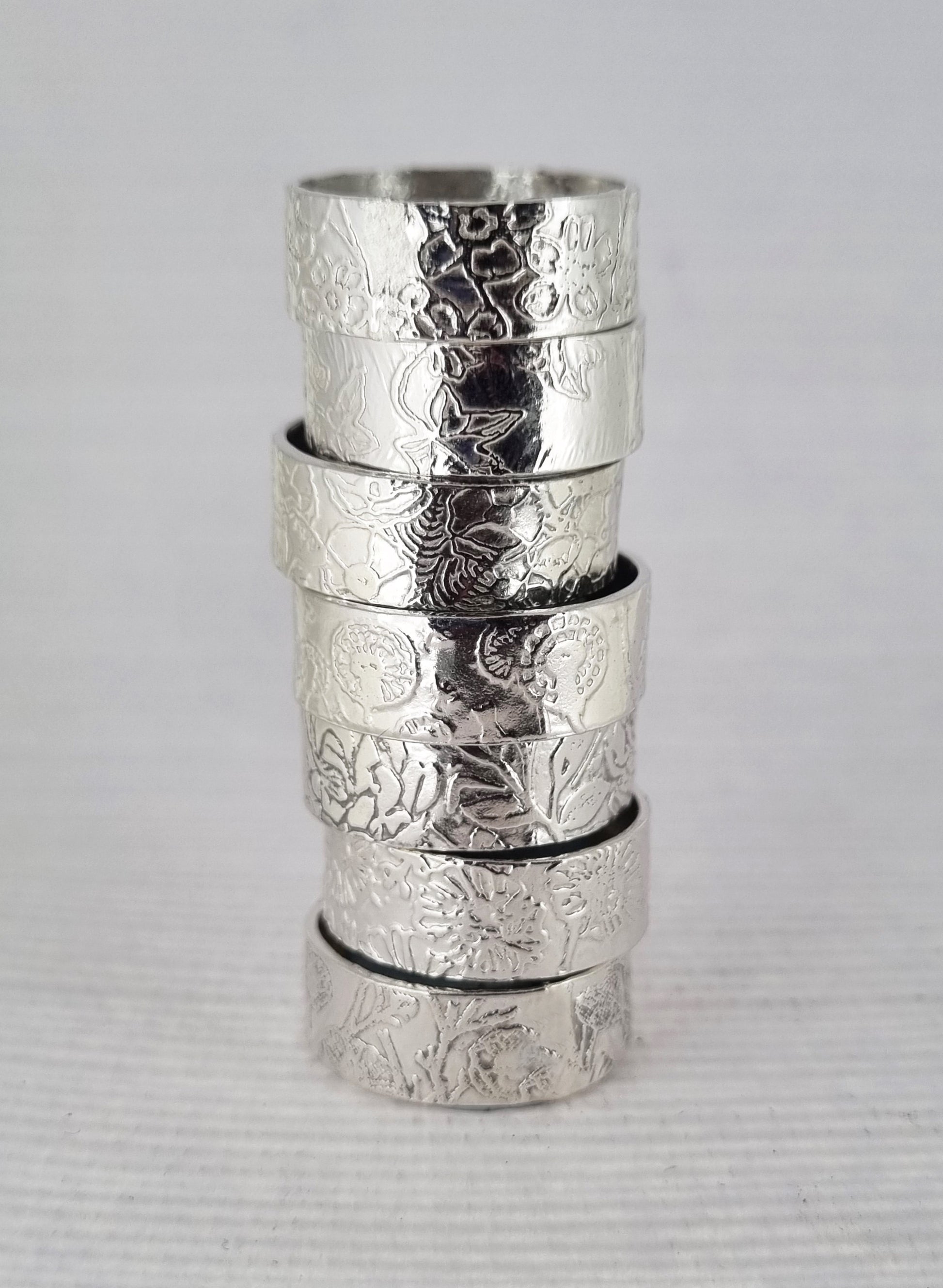 A sterling silver ring handmade from 1mm thick metal. Each ring is either 6mm or 8mm wide and etched by hand with my own pretty flower design. A simple ring with a lovely floral finish.