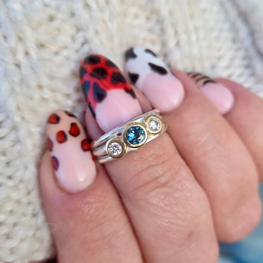 It's a trio of connected silver bands holding gold settings and gemstones. Take a look at the different options